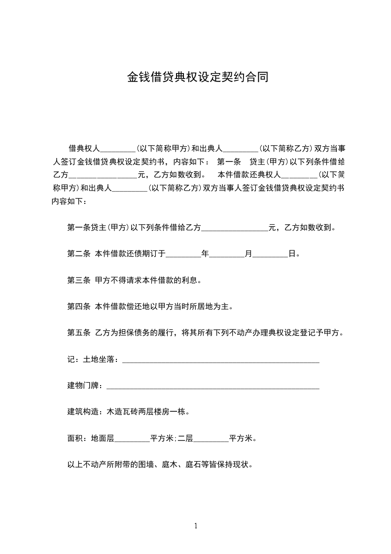 典权人_________(以下简称甲方)和出典人_________(以下简称乙方)双方当事人签订金钱借贷典权设定契约书,内容如下:
