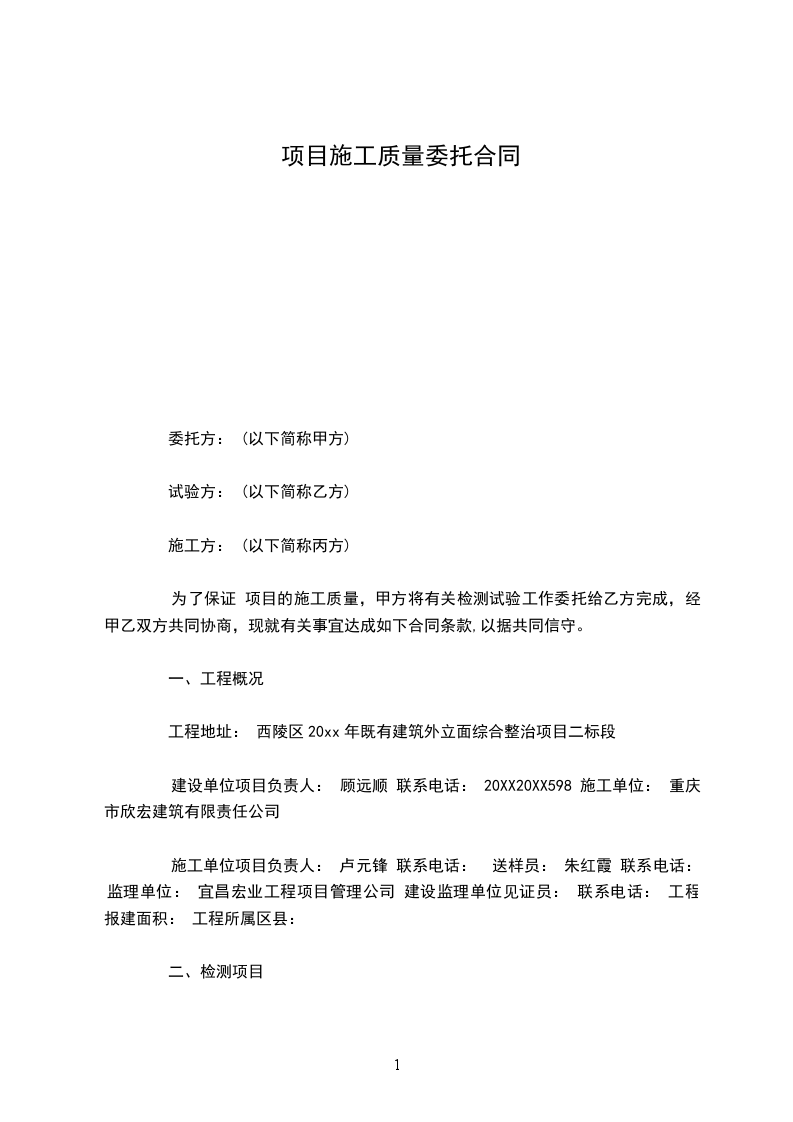 为了保证 项目的施工质量,甲方将有关检测试验工作委托给乙方完成,经甲乙双方共同协商,现就有关事宜达成如下合同条款,以据共同信守。
