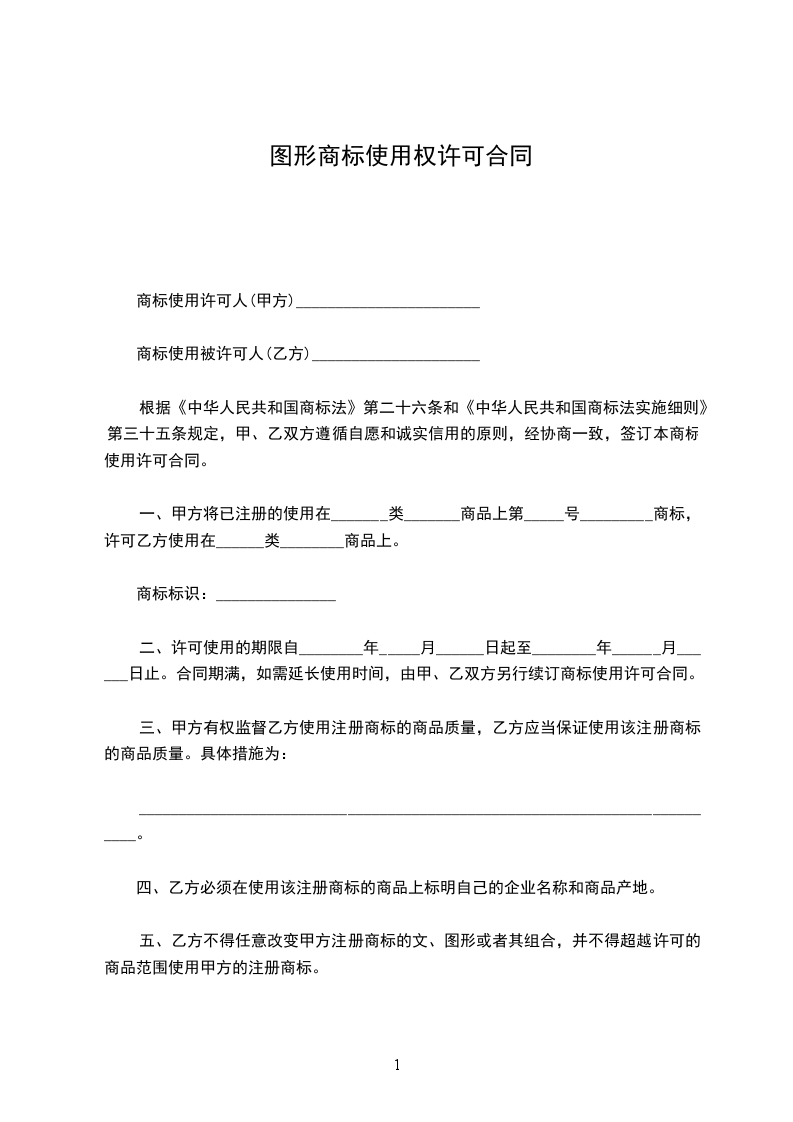 一、甲方将已注册的使用在_______类_______商品上第_____号_________商标,许可乙方使用在______类________商品上。