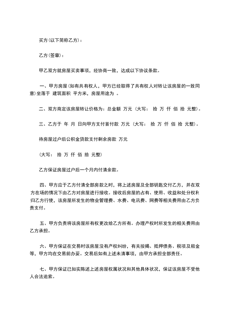 二、双方商定该房屋转让价格为:总金额 万元 (大写: 拾 万 仟 佰 拾 元整)。