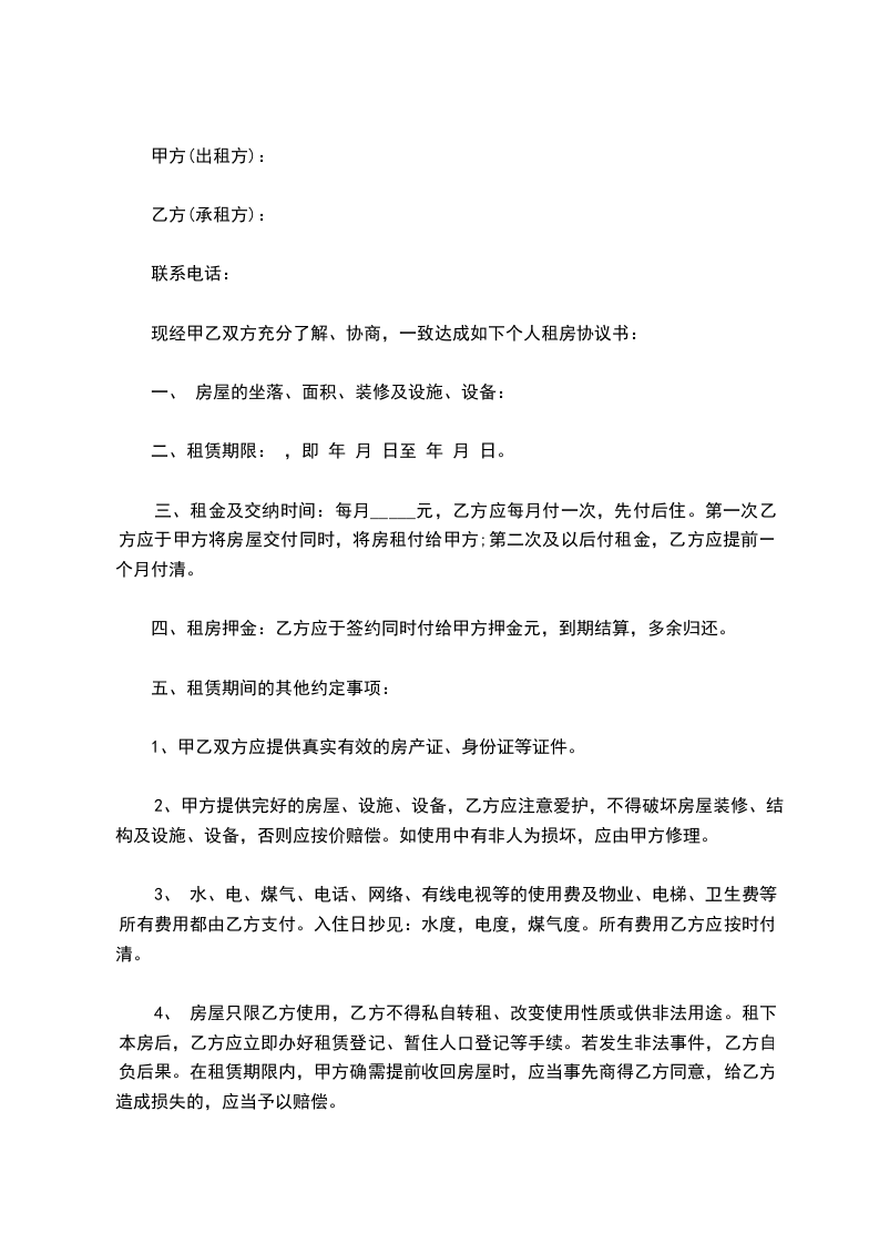 现经甲乙双方充分了解、协商,一致达成如下个人租房协议书:
