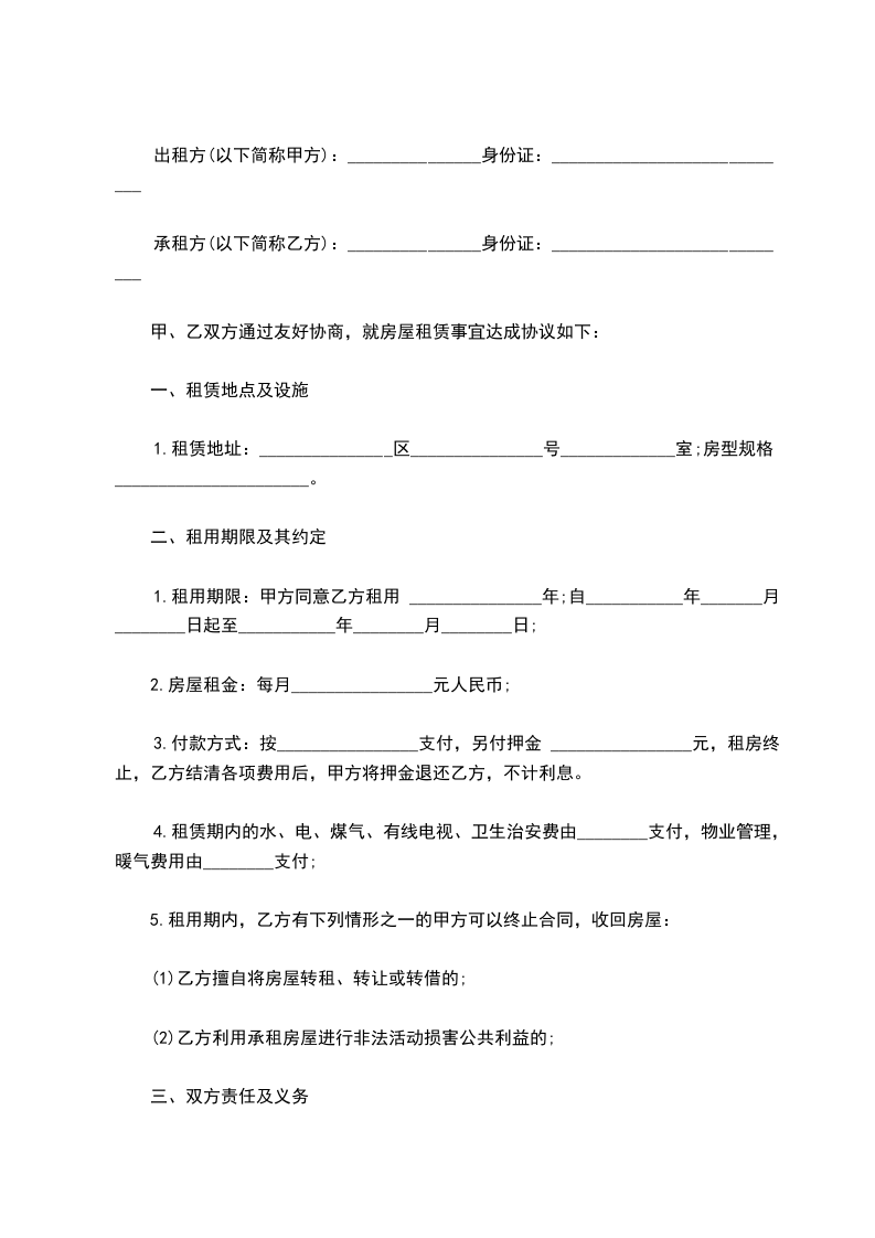 4、 房屋只限乙方使用,乙方不得私自转租、改变使用性质或供非法用途。租下本房后,乙方应立即办好租赁登记、暂住人口登记等手续。若发生非法事件,乙方自负后果。在租赁期限内,甲方确需提前收回房屋时,应当事先商得乙方同意,给乙方造成损失的,应当予以赔偿。