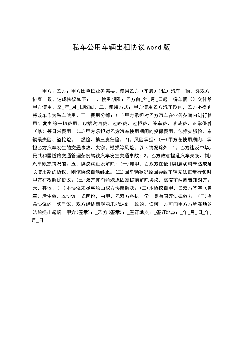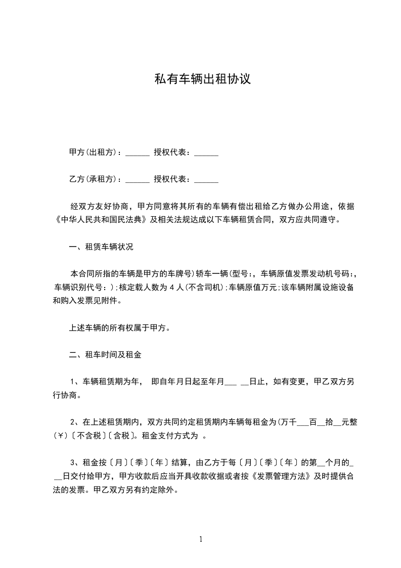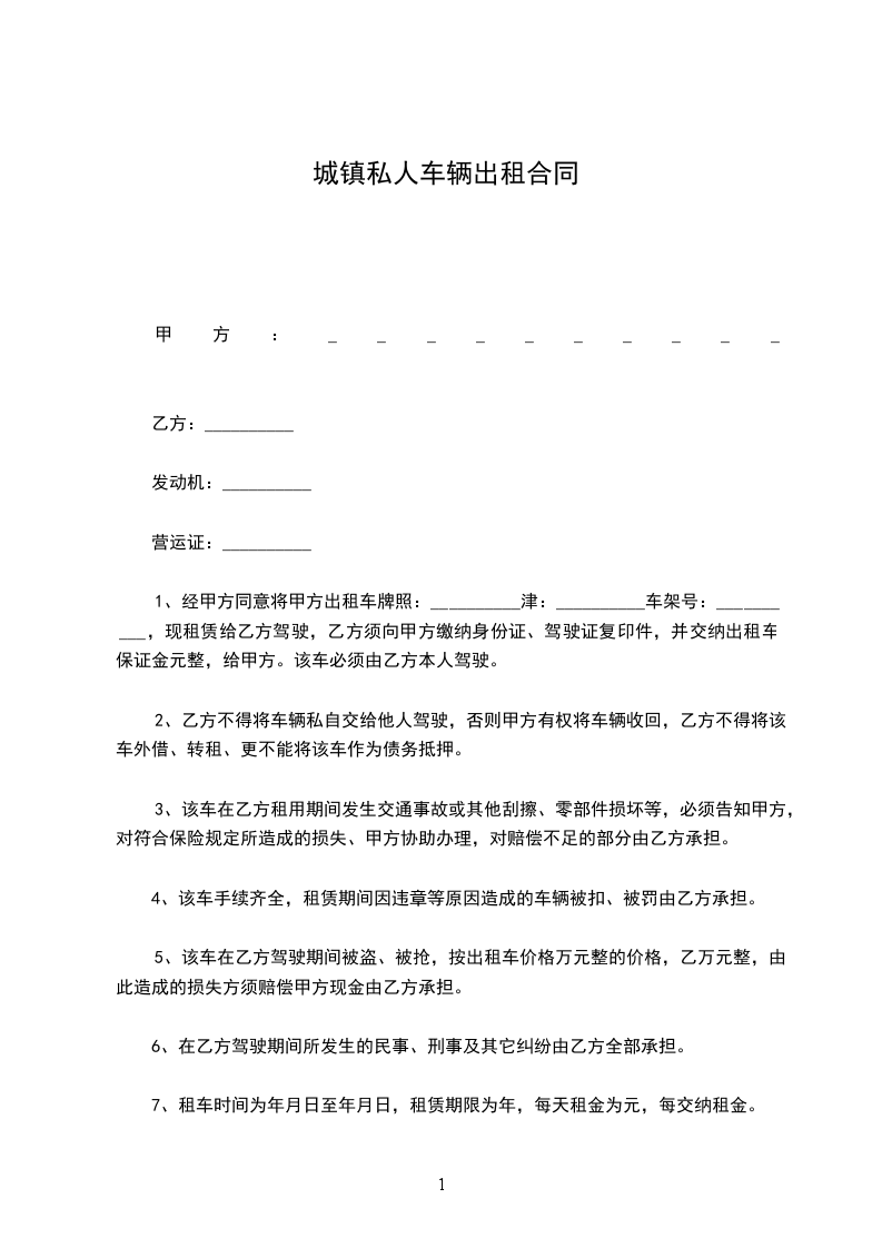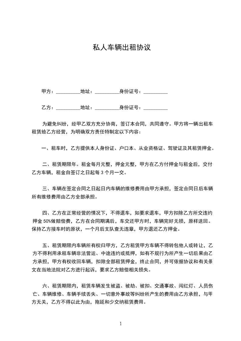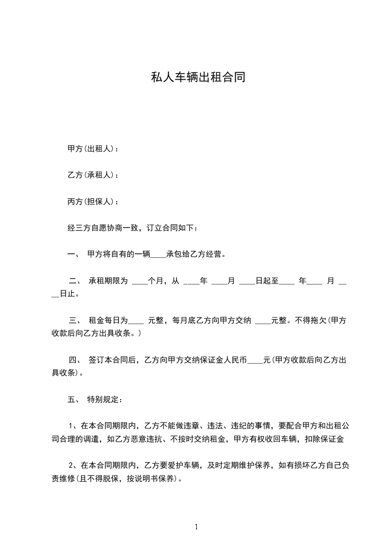 一、 甲方将自有的一辆____承包给乙方经营。