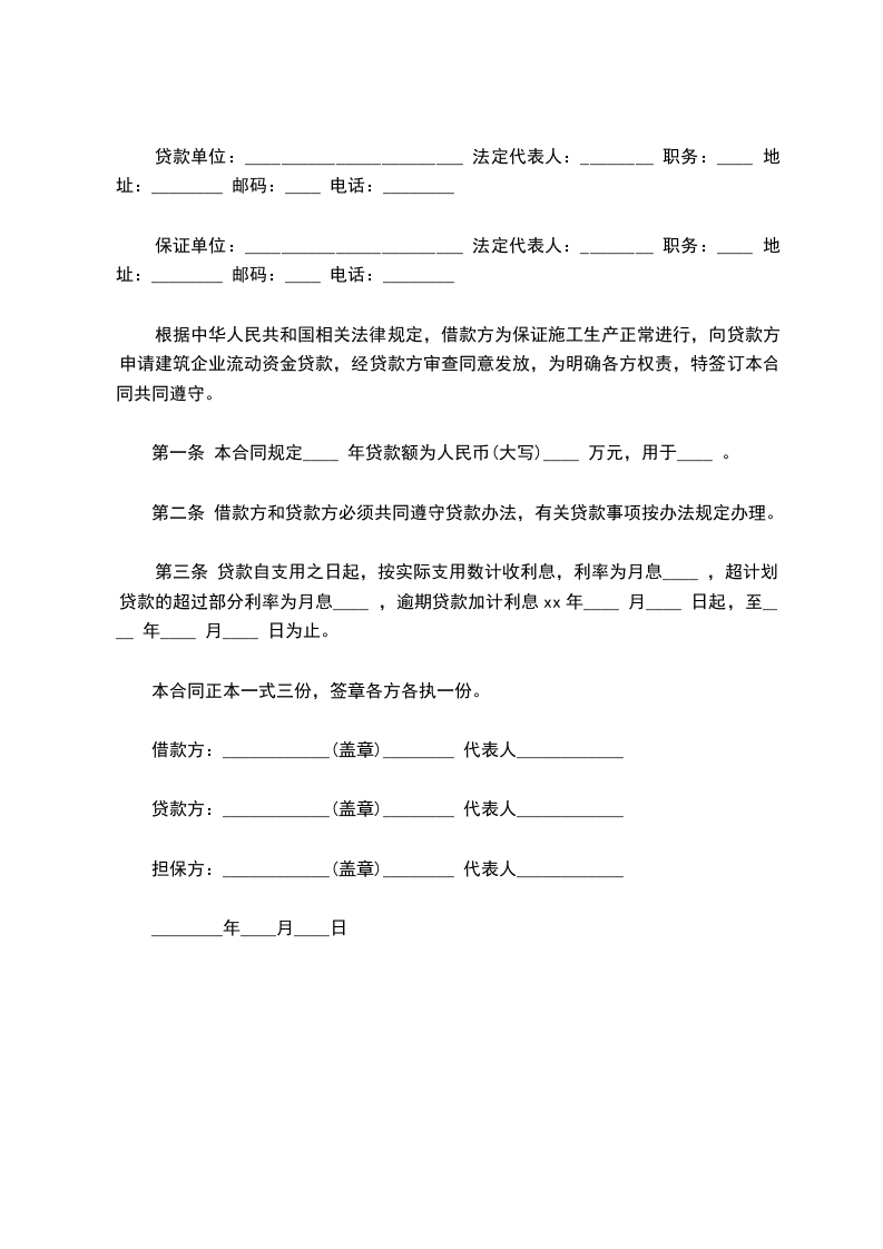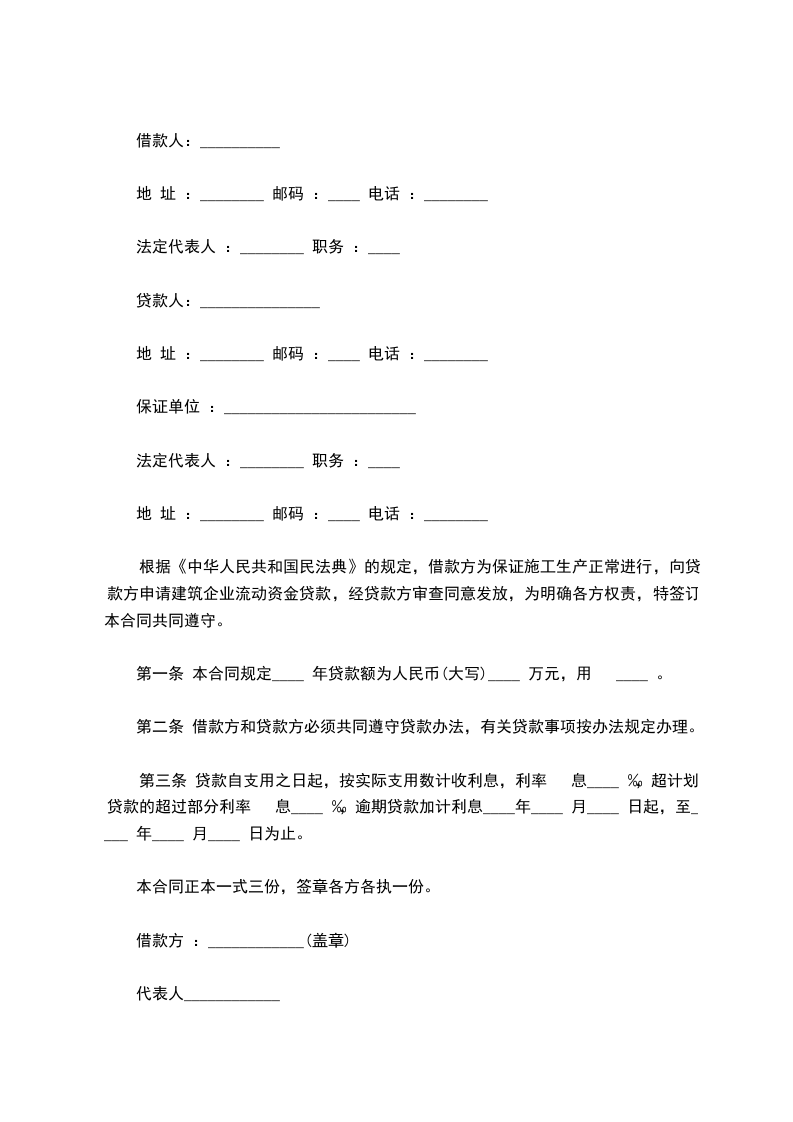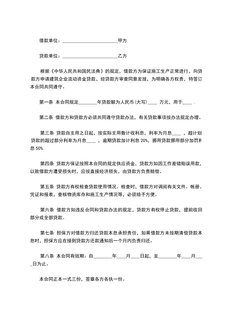 根据中华人民共和国相关法律规定,借款方为保证施工生产正常进行,向贷款方申请建筑企业流动资金贷款,经贷款方审查同意发放,为明确各方权责,特签订本合同共同遵守。