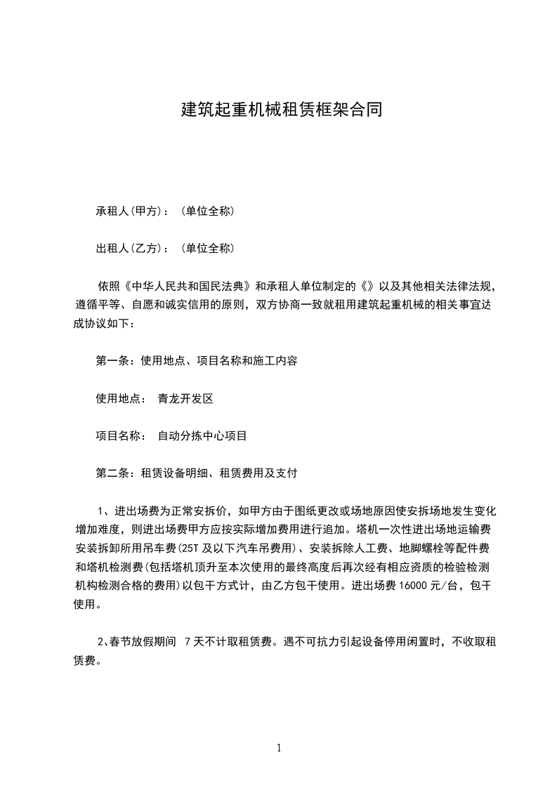 依照《中华人民共和国民法典》和承租人单位制定的《》以及其他相关法律法规,遵循平等、自愿和诚实信用的原则,双方协商一致就租用建筑起重机械的相关事宜达成协议如下: