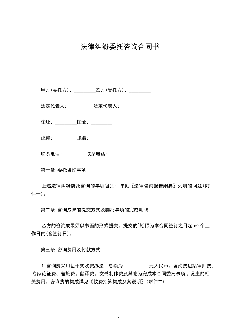 1.咨询费采用包干式收费办法,总额为_________ 元人民币。咨询费包括律师费、专家论证费、差旅费、翻译费、文书制作费及其他为完成本合同委托事项所发生的相关费用。咨询费的构成详见《收费预算构成及其说明》(附件二)