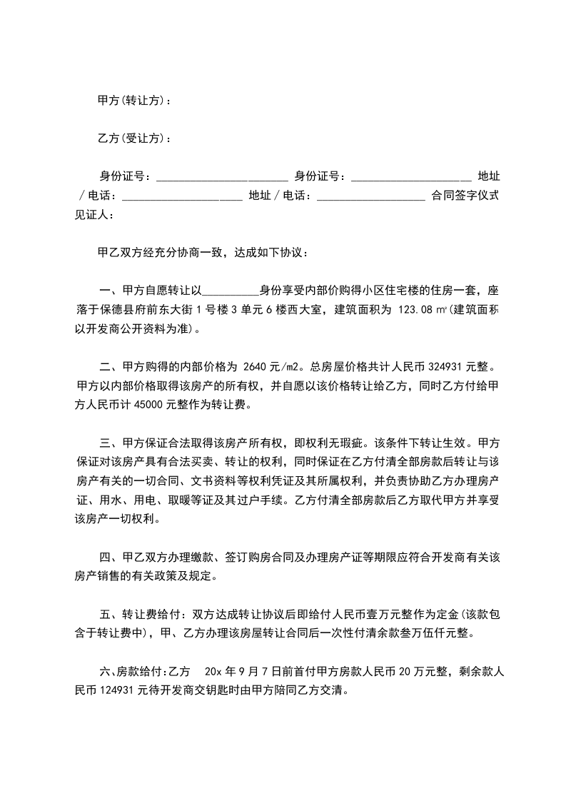 一、甲方自愿转让以__________身份享受内部价购得小区住宅楼的住房一套,座落于保德县府前东大街1号楼3单元6楼西大室,建筑面积为 123.08㎡(建筑面积以开发商公开资料为准)。