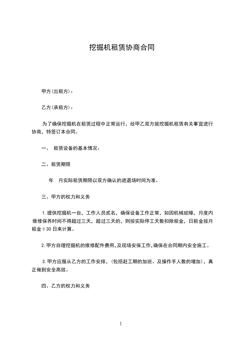 1.提供挖掘机一台,工作人员贰名,确保设备工作正常,如因机械故障,月度内维修保养时间不得超过三天,超过三天的,则按实际停工天数扣除租金,日租金按月租金÷30日来计算。