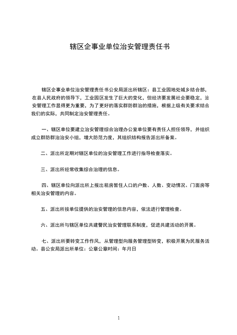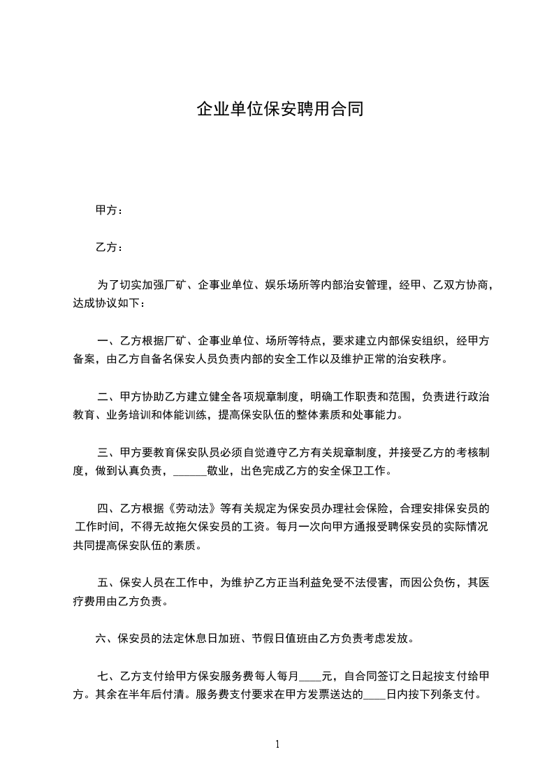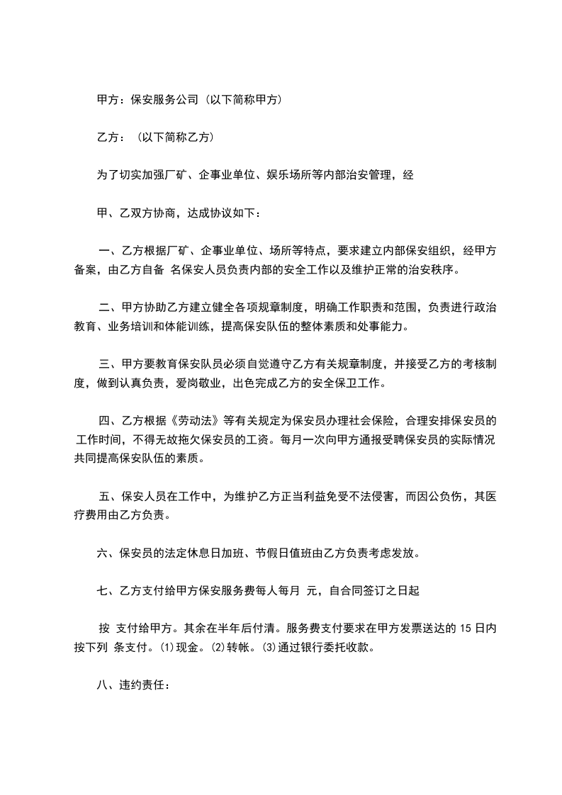 一、乙方根据厂矿、企事业单位、场所等特点,要求建立内部保安组织,经甲方备案,由乙方自备 名保安人员负责内部的安全工作以及维护正常的治安秩序。