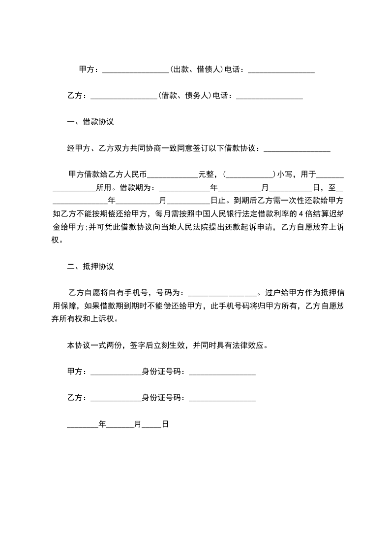 第一条 乙方借给甲方人民币 元整(小写¥: 元)。利息为: 。借款期限( 年 月 日起至 年 月 日止,共计 天。
