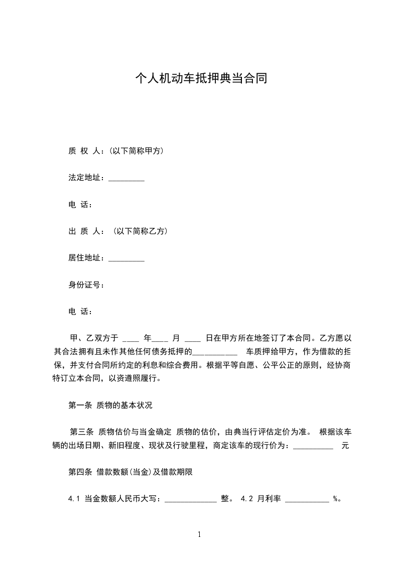第二条 甲方自愿将汽车一台质押给乙方。车辆牌号为: ,型号: ,机动车驾驶证号码: ,发动机号: ,车架号: ,双方评估价值 万元整。