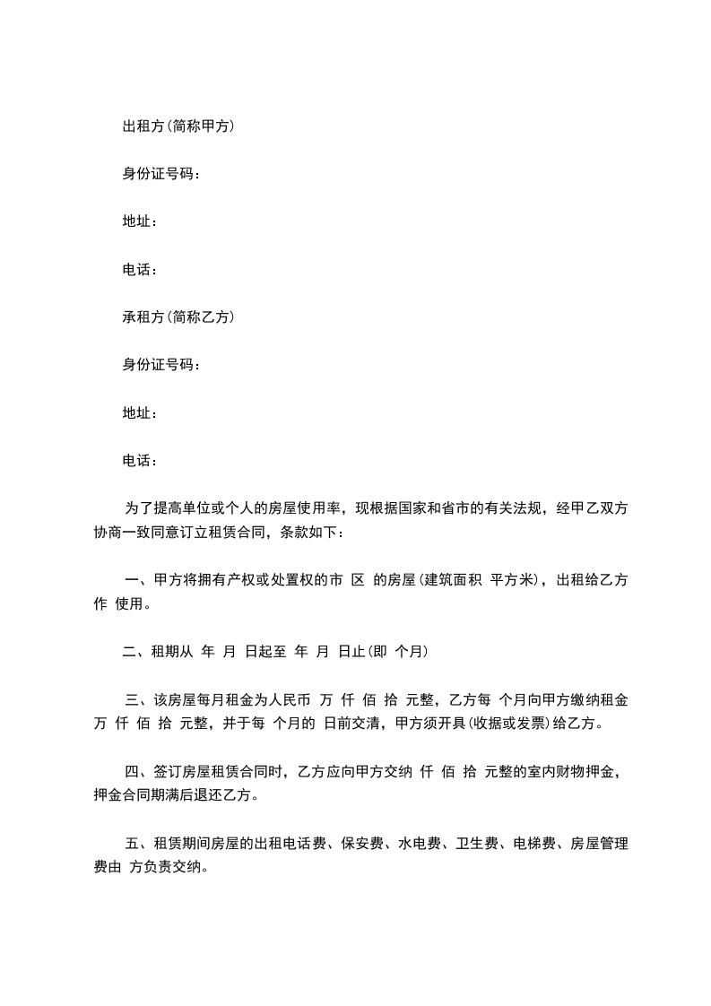 为了提高单位或个人的房屋使用率,现根据国家和省市的有关法规,经甲乙双方协商一致同意订立租赁合同,条款如下: