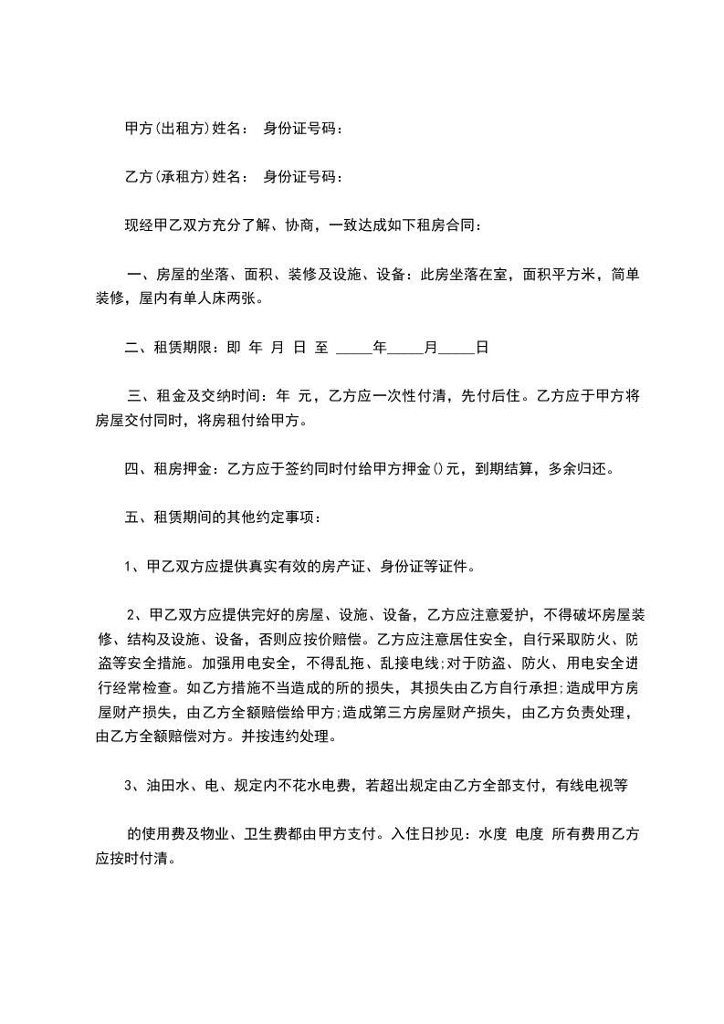 四、租房押金:乙方应于签约同时付给甲方押金()元,到期结算,多余归还。