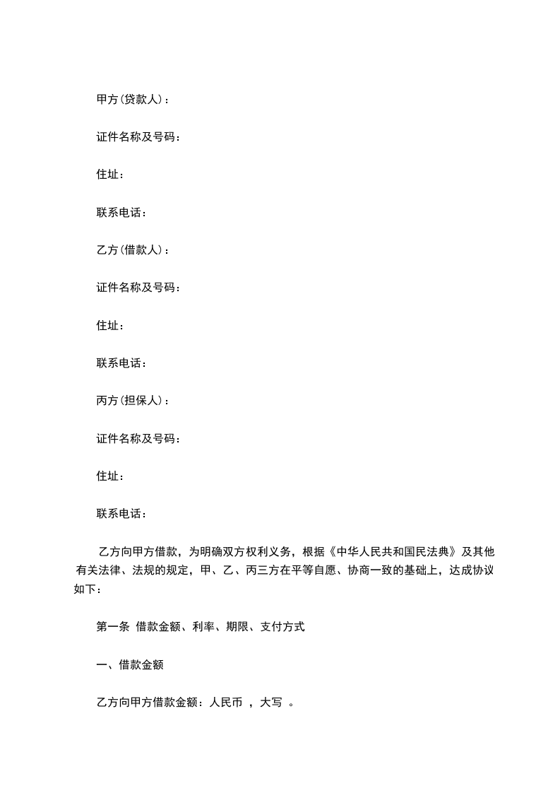 乙方向甲方借款,为明确双方权利义务,根据《中华人民共和国民法典》及其他有关法律、法规的规定,甲、乙、丙三方在平等自愿、协商一致的基础上,达成协议如下: