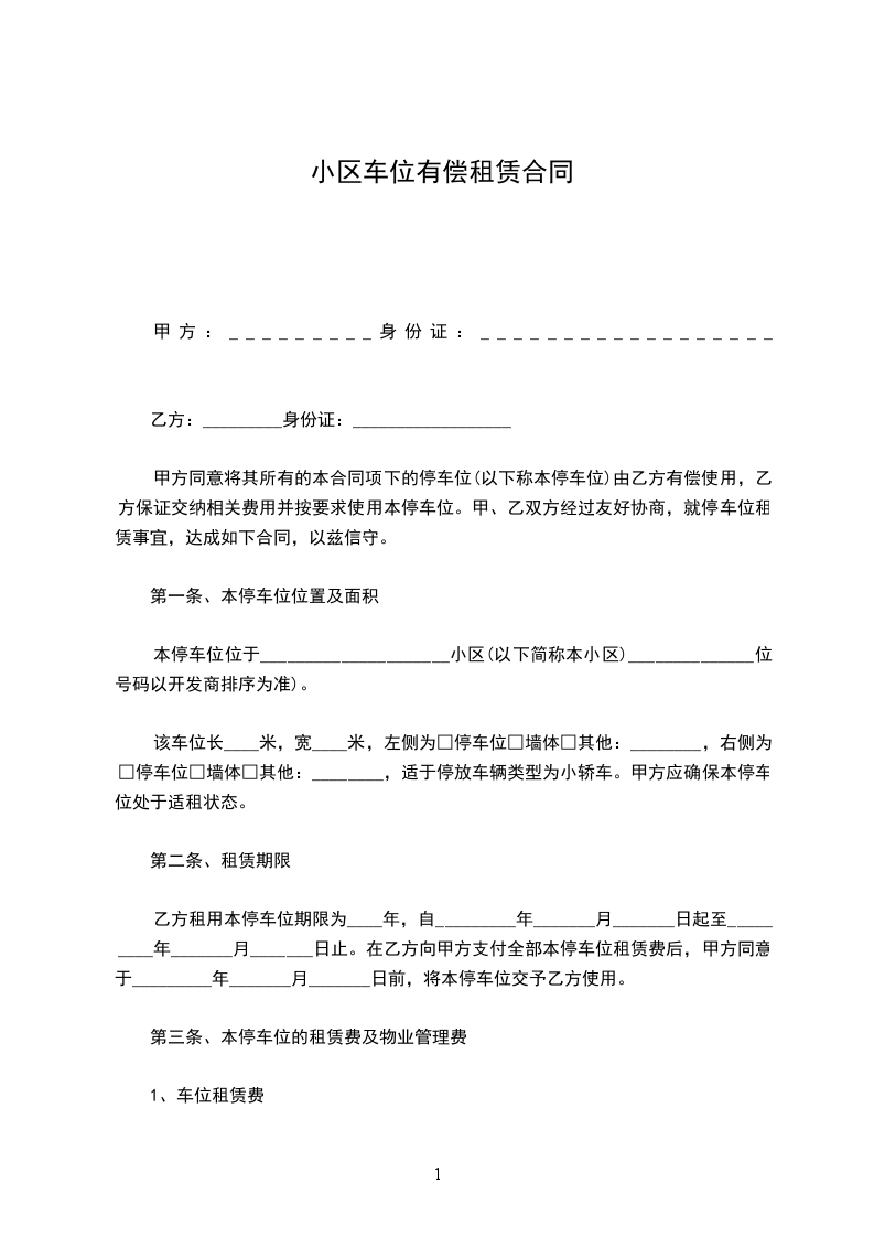 乙方租赁本停车位每 壹 年应向甲方支付租赁费为人民币________元(小写RMB________元)。该租赁费□包含□不包含本小区物业管理单位收取的停车管理费。