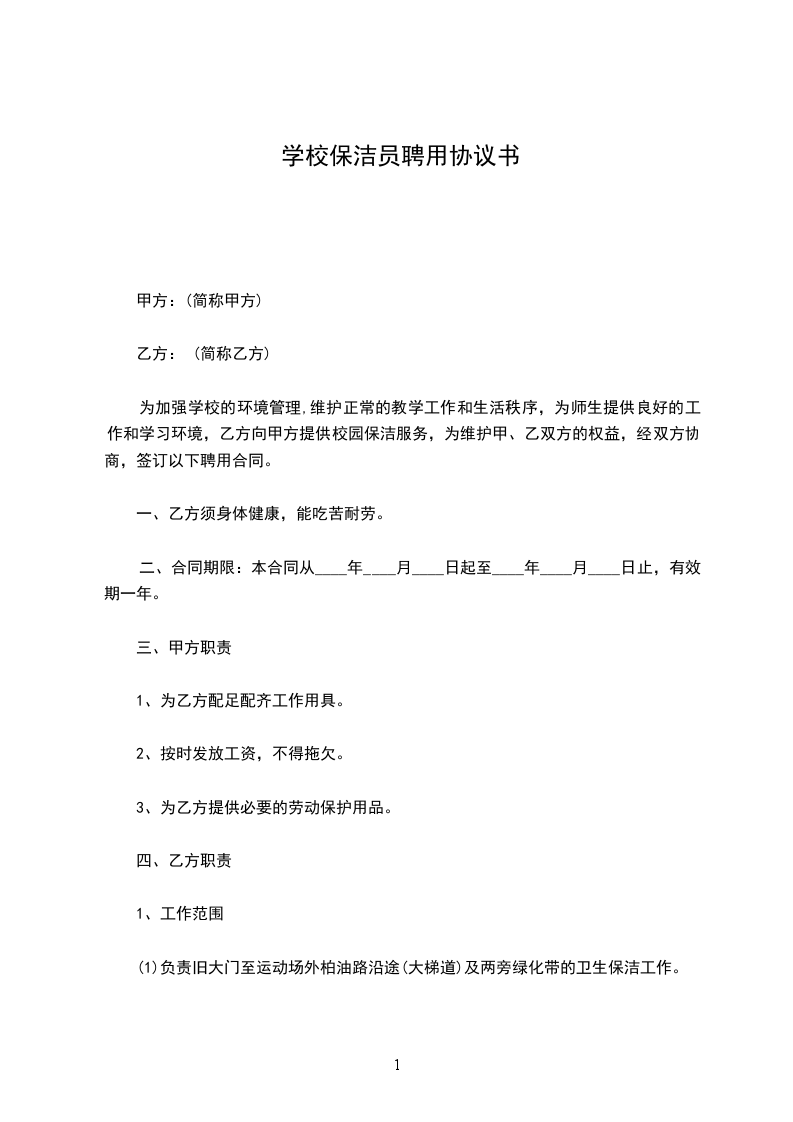 为加强学校的环境管理,维护正常的教学工作和生活秩序,为师生提供良好的工作和学习环境,乙方向甲方提供校园保洁服务,为维护甲、乙双方的权益,经双方协商,签订以下聘用合同。