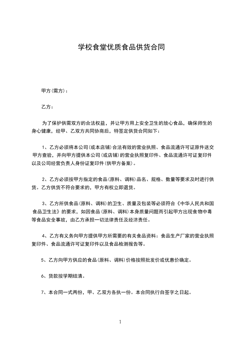 为了保护供需双方的合法权益,并让甲方用上安全卫生的放心食品,确保师生的身心健康,经甲、乙双方共同协商后,特签定供货合同如下: