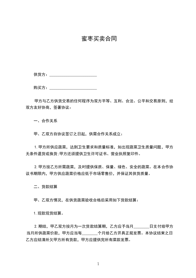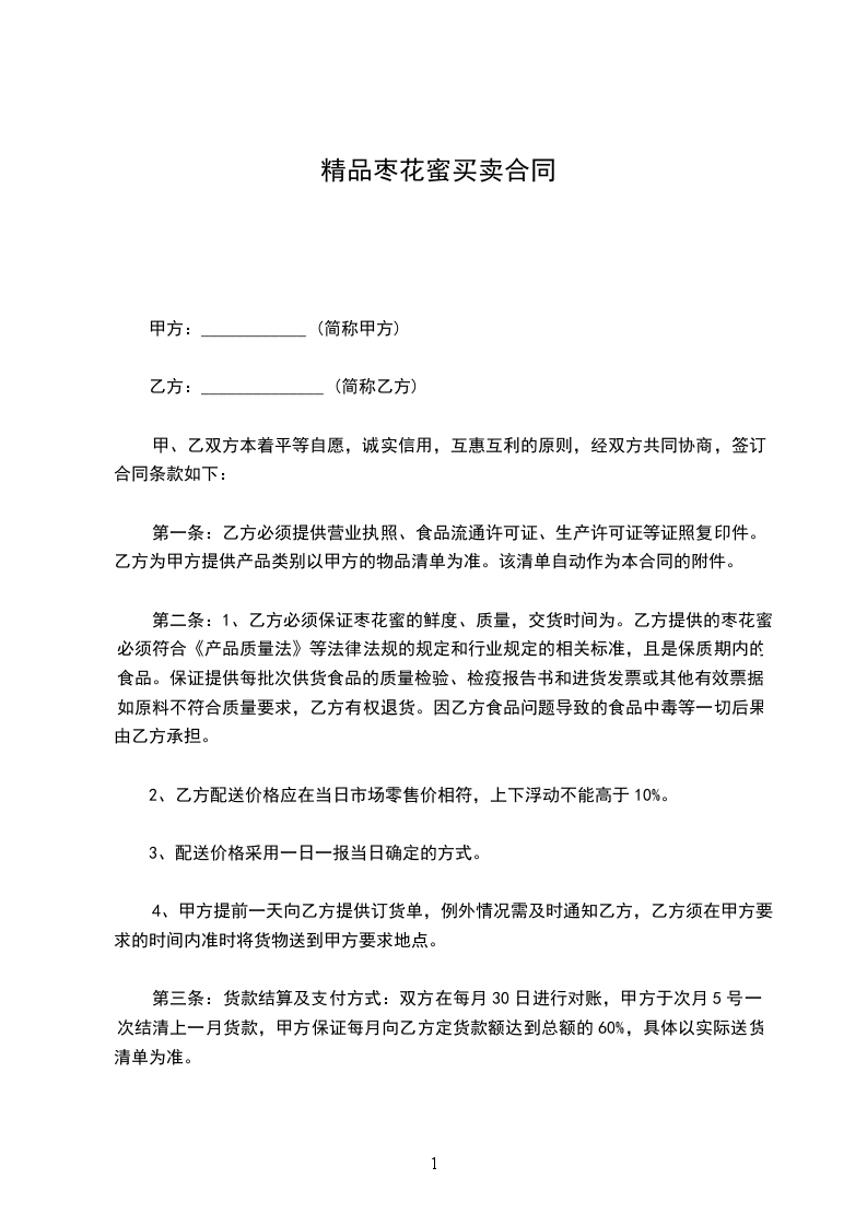 第二条:1、乙方必须保证枣花蜜的鲜度、质量,交货时间为。乙方提供的枣花蜜必须符合《产品质量法》等法律法规的规定和行业规定的相关标准,且是保质期内的食品。保证提供每批次供货食品的质量检验、检疫报告书和进货发票或其他有效票据。如原料不符合质量要求,乙方有权退货。因乙方食品问题导致的食品中毒等一切后果由乙方承担。