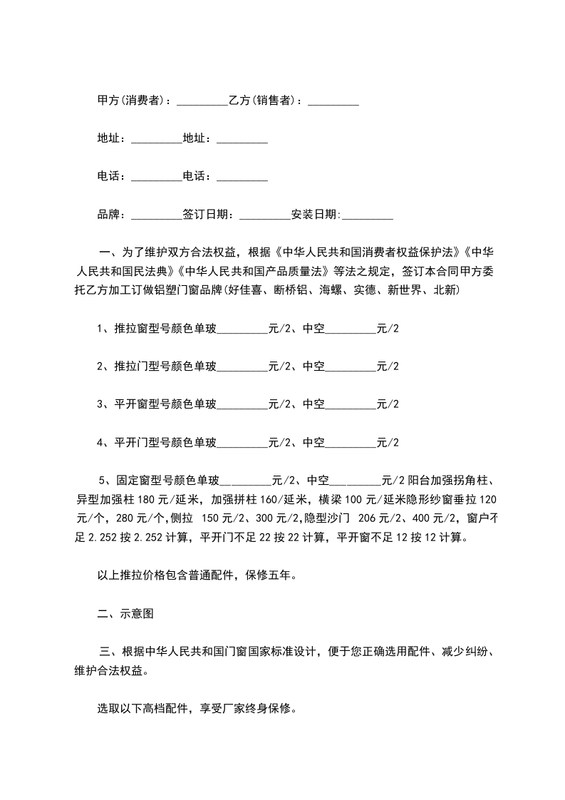 一、为了维护双方合法权益,根据《中华人民共和国消费者权益保护法》《中华人民共和国民法典》《中华人民共和国产品质量法》等法之规定,签订本合同甲方委托乙方加工订做铝塑门窗品牌(好佳喜、断桥铝、海螺、实德、新世界、北新)