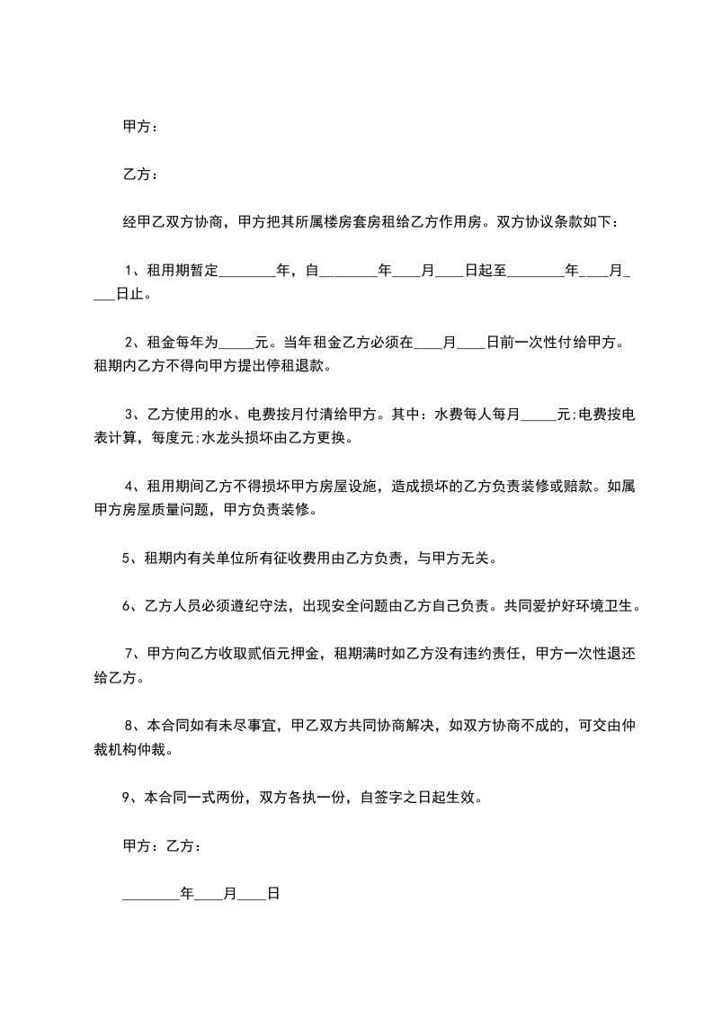 2、租金每年为_____元。当年租金乙方必须在____月____日前一次性付给甲方。租期内乙方不得向甲方提出停租退款。