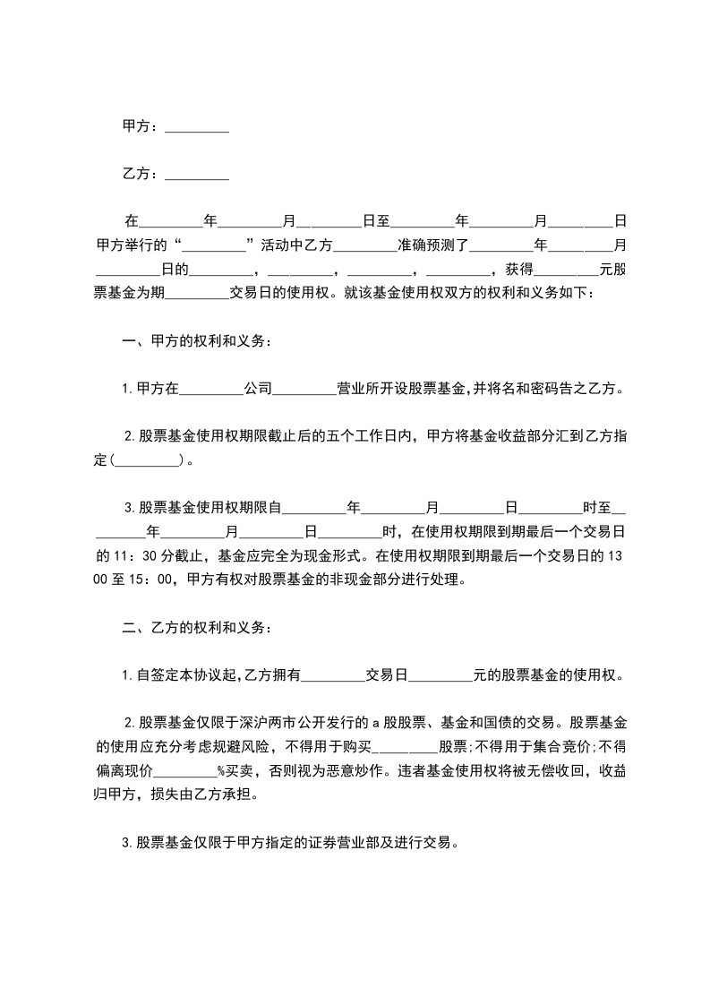 在_________年_________月_________日至_________年_________月_________日甲方举行的“_________”活动中乙方_________准确预测了_________年_________月_________日的_________,_________,_________,_________,获得_________元股票基金为期_________交易日的使用权。就该基金使用权双方的权利和义务如下: