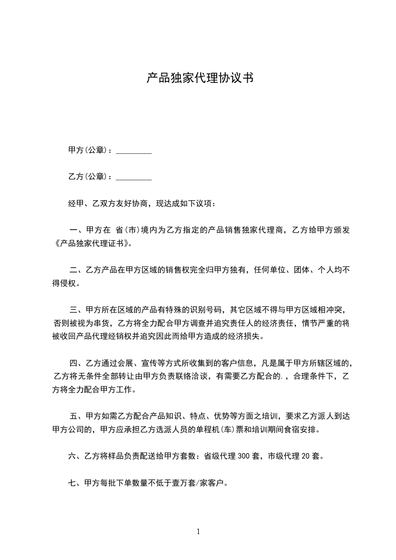 一、甲方在 省(市)境内为乙方指定的产品销售独家代理商,乙方给甲方颁发《产品独家代理证书》。