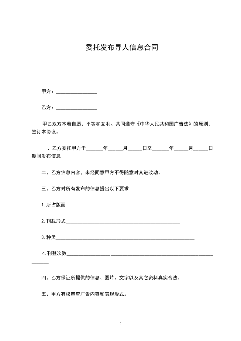 一、乙方委托甲方于_______年______月______日至_______年______月______日期间发布信息(彩色/黑白/入网)