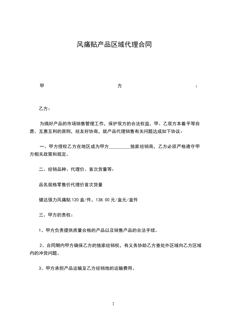 4、合同签订后,乙方如在三天内不提货,或三个月内没有二次提货者,乙方在约定区域内的代理权自然取消。