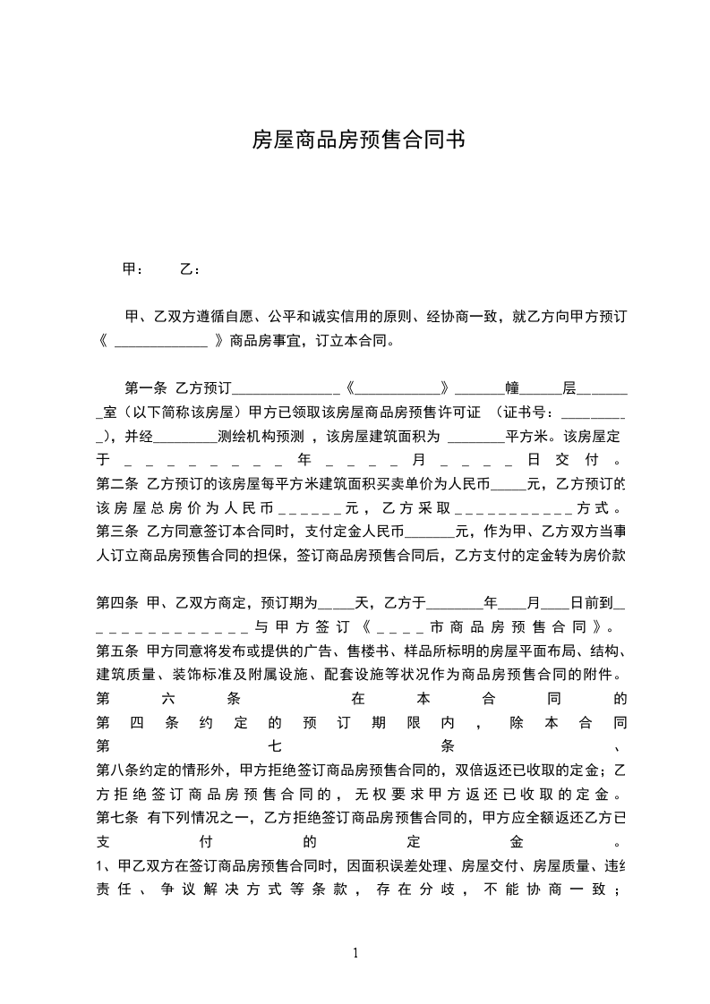 甲、乙双方遵循自愿、公平和诚实信用的原则、经协商一致,就乙方向甲方预订《 _____________ 》商品房事宜,订立本合同。