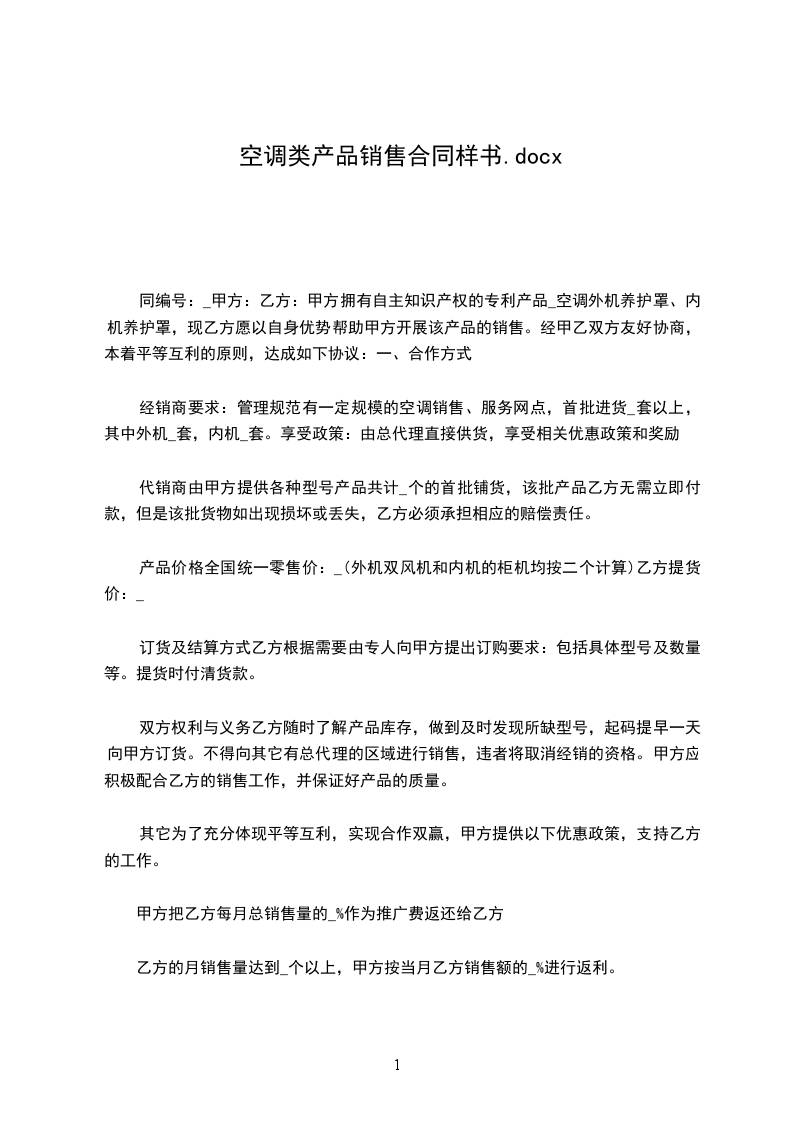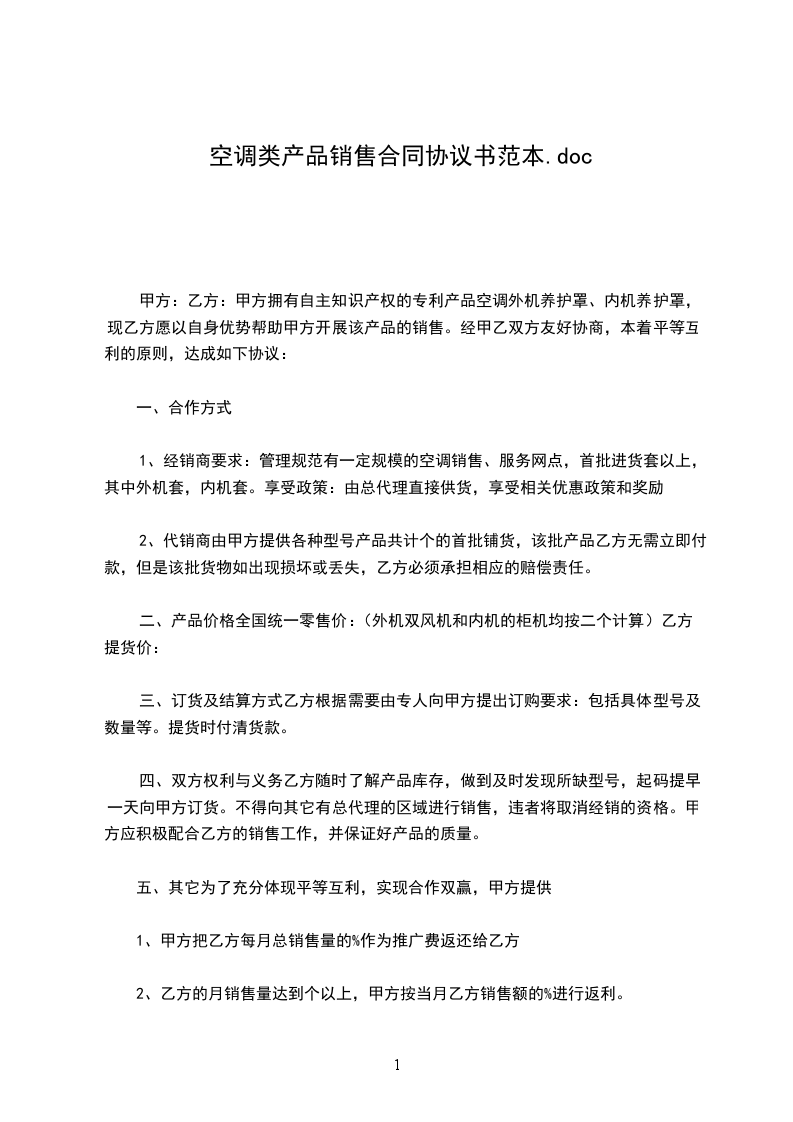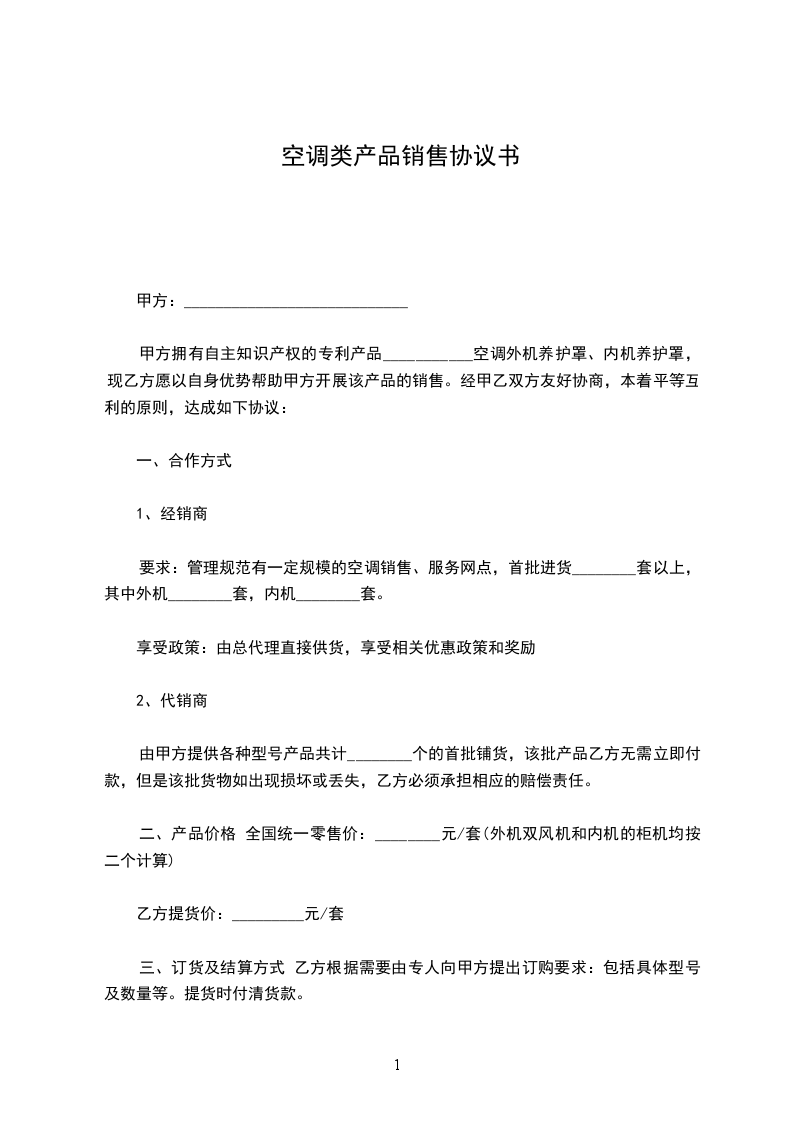 甲方拥有自主知识产权的专利产品___________空调外机养护罩、内机养护罩,现乙方愿以自身优势帮助甲方开展该产品的销售。经甲乙双方友好协商,本着平等互利的原则,达成如下协议: