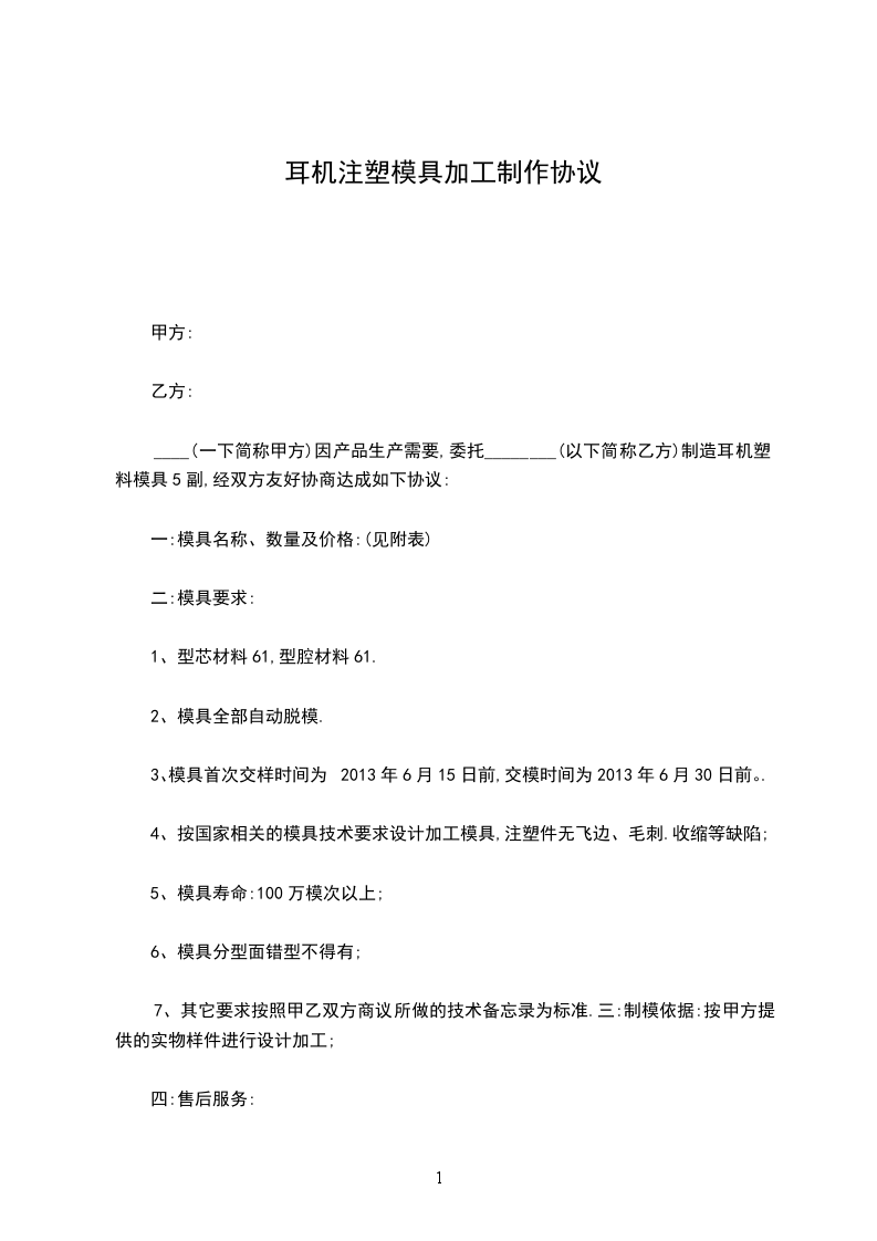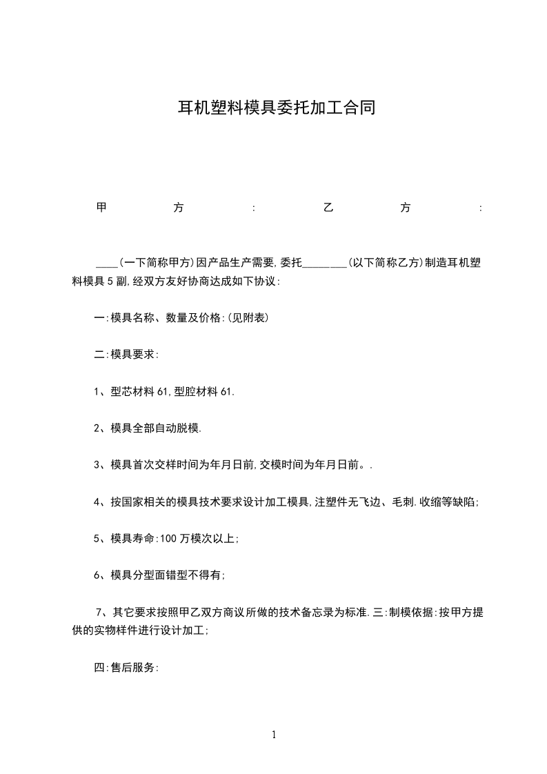 ____(一下简称甲方)因产品生产需要,委托________(以下简称乙方)制造耳机塑料模具5副,经双方友好协商达成如下协议: