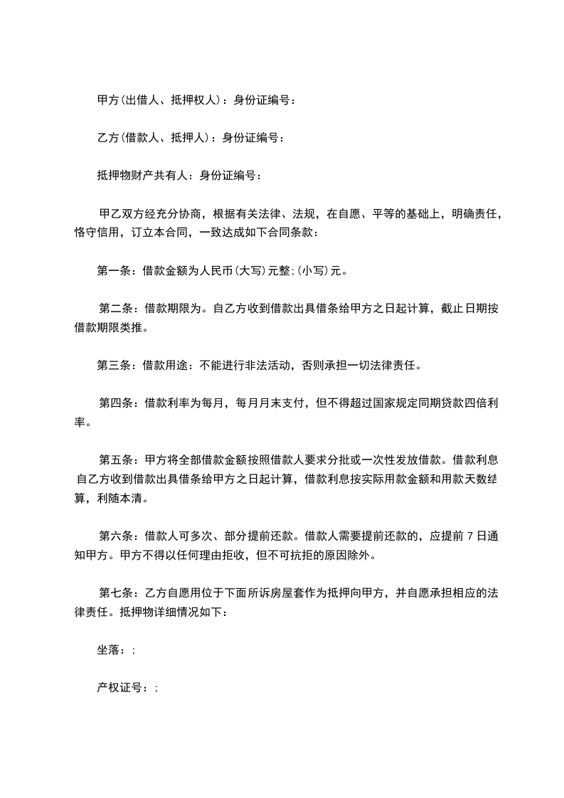 第七条:乙方自愿用位于下面所诉房屋套作为抵押向甲方,并自愿承担相应的法律责任。抵押物详细情况如下:
