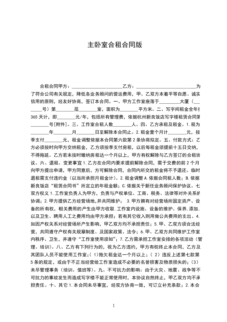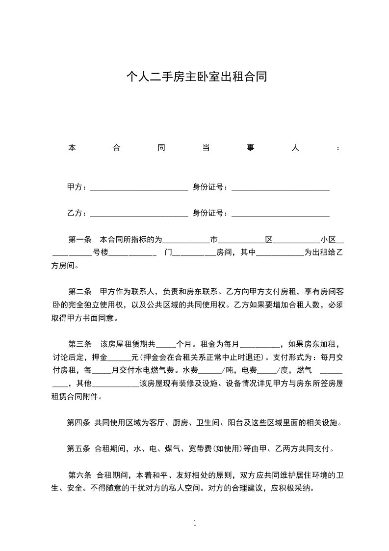 第一条 本合同所指标的为____________市____________区____________小区____________号楼____________ 门___________房间,其中____________为出租给乙方房间。