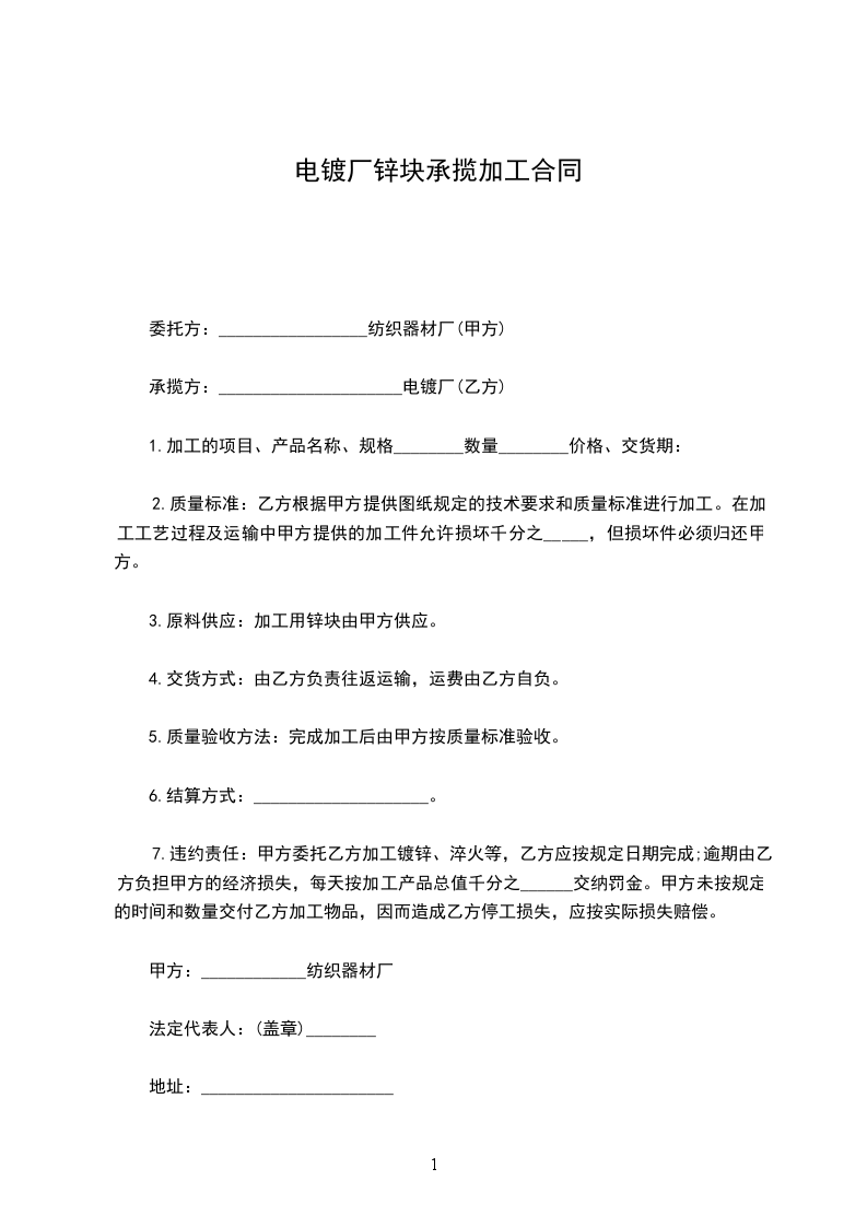 7.违约责任:甲方委托乙方加工镀锌、淬火等,乙方应按规定日期完成;逾期由乙方负担甲方的经济损失,每天按加工产品总值千分之______交纳罚金。甲方未按规定的时间和数量交付乙方加工物品,因而造成乙方停工损失,应按实际损失赔偿。