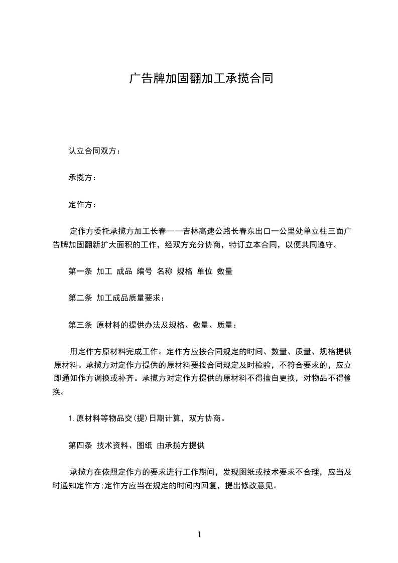 定作方委托承揽方加工长春——吉林高速公路长春东出口一公里处单立柱三面广告牌加固翻新扩大面积的工作,经双方充分协商,特订立本合同,以便共同遵守。