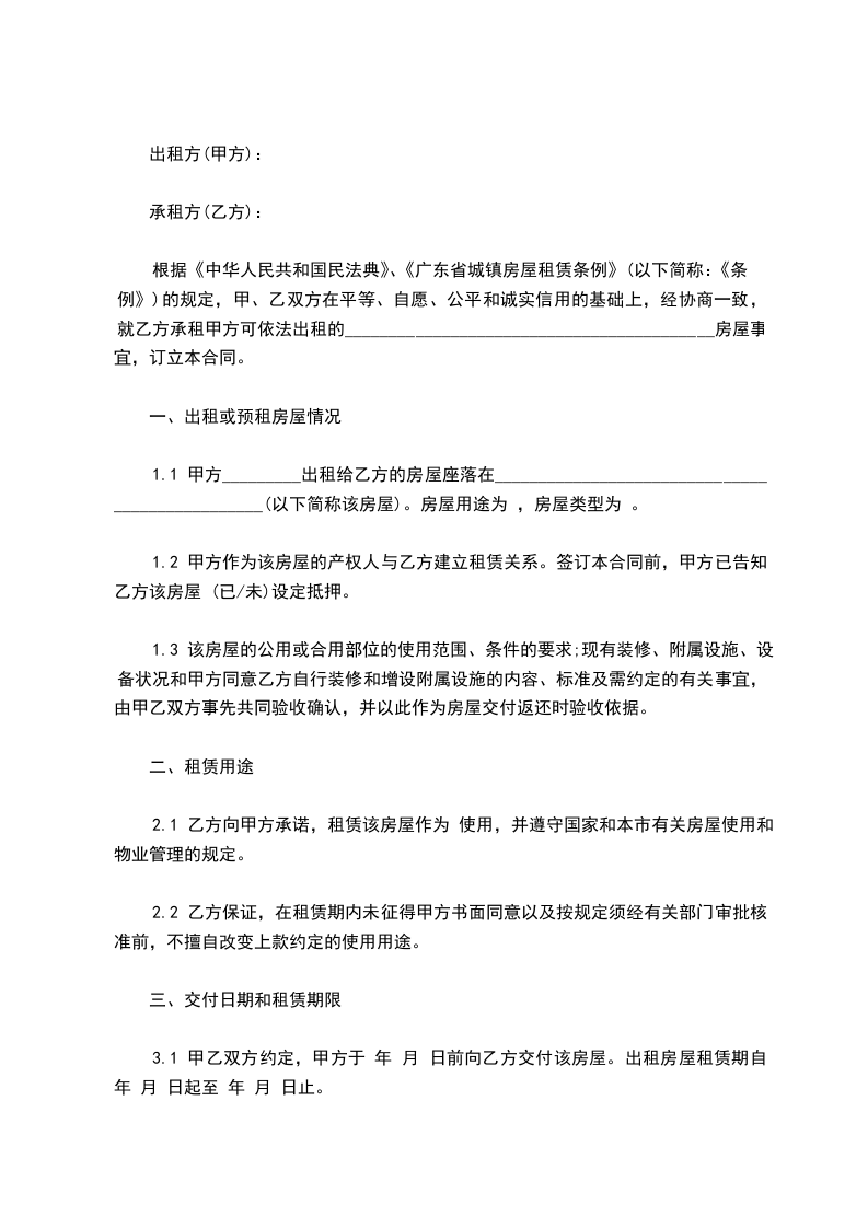 根据《中华人民共和国民法典》、《广东省城镇房屋租赁条例》(以下简称:《条例》)的规定,甲、乙双方在平等、自愿、公平和诚实信用的基础上,经协商一致,就乙方承租甲方可依法出租的__________________________________________房屋事宜,订立本合同。