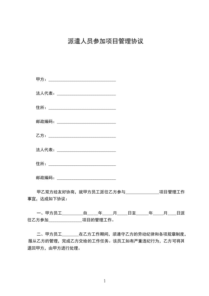 一、甲方员工__________自_____年_____月_____日至______年_____月____日派往乙方参加________________项目的管理工作。