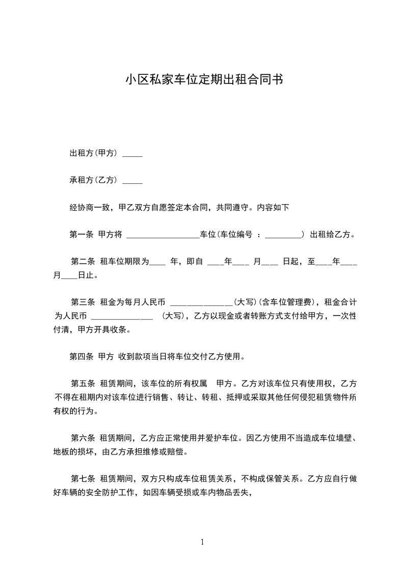 一、本车位租金_________元整月,大写:____________________.支付方式为____________________.乙方到期如需续租,需提前 个月通知甲方。乙方留存租金收条作为支付凭证,车位管理费用由甲方支付。