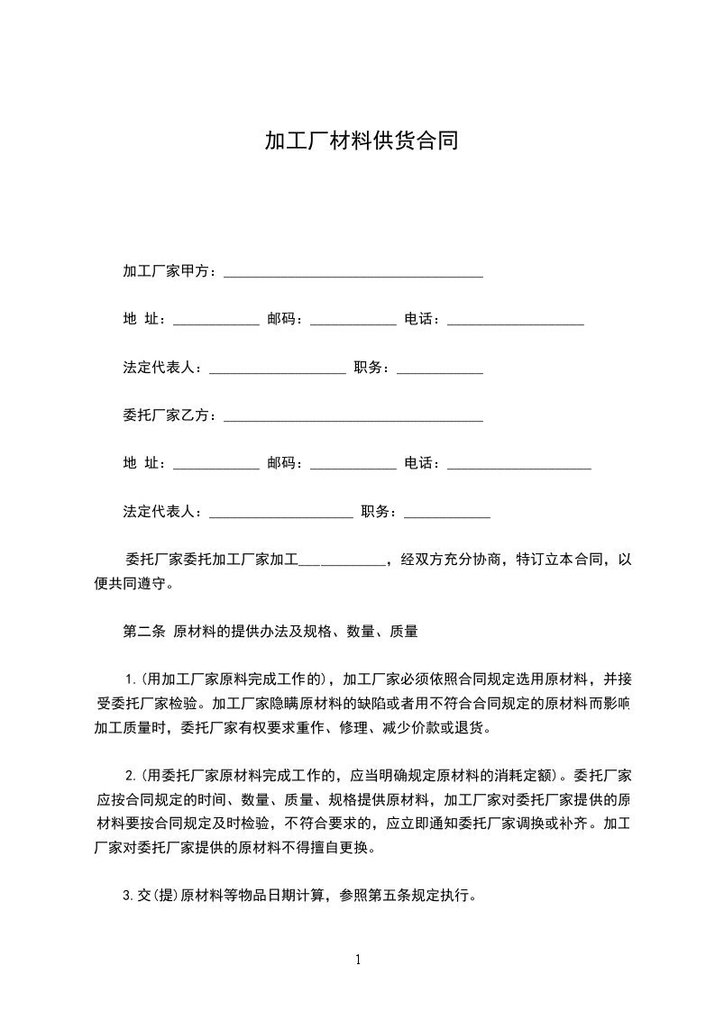 服装厂面料供货协议