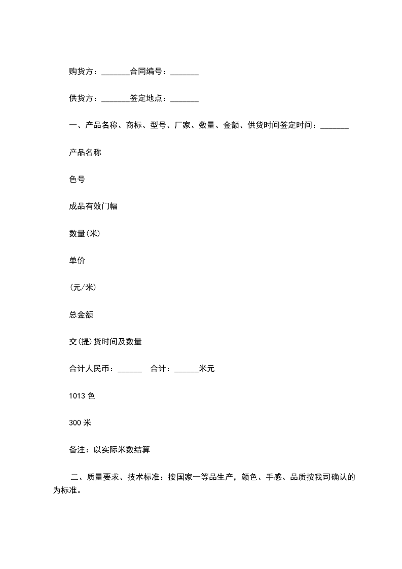 一、产品名称、商标、型号、厂家、数量、金额、供货时间签定时间:产品名称色号成品有效门幅数量(米)单价(元/米)总金额交(提)货时间及数量合计人民币:合计:米元1013色300米备注:以实际米数结算