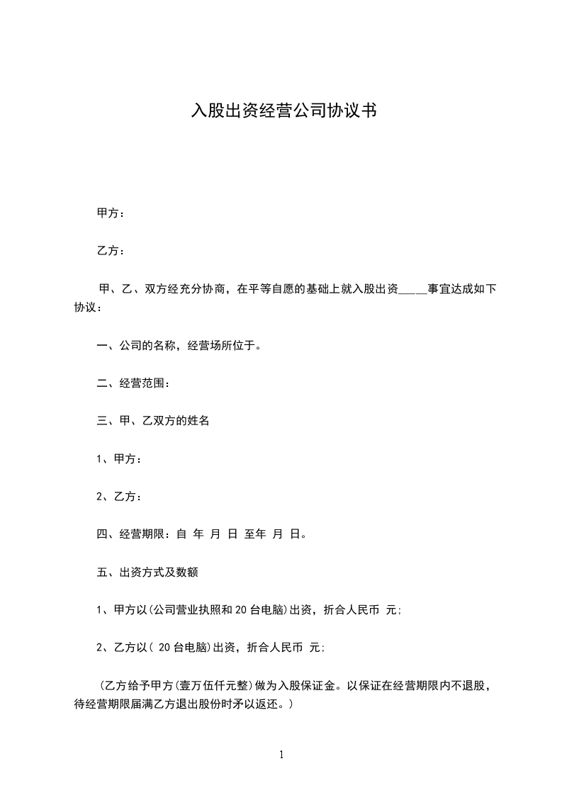 2、乙方以现金出资,折合人民币大写:小写 元; 乙方给予甲方( 万元整)做为入股保证金。以保证在经营期限内不退股,待经营期限届满乙方退出股份时矛以返还。)