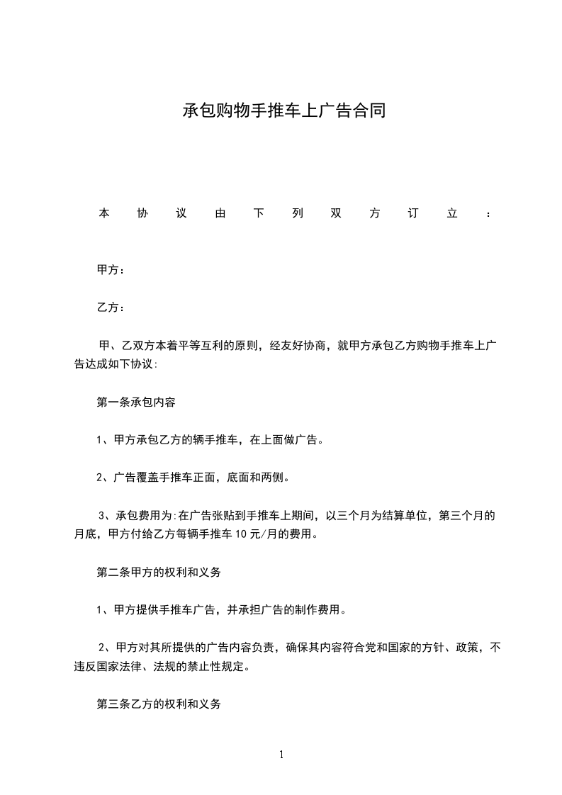 甲、乙双方本着平等互利的原则,经友好协商,就甲方承包乙方购物手推车上广告达成如下协议:
