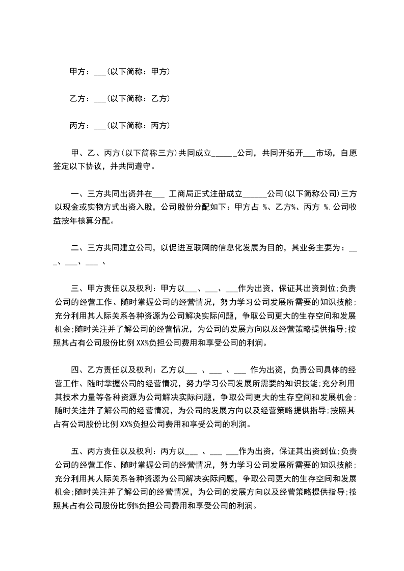甲、乙、丙方(以下简称三方)共同成立______公司,共同开拓开___市场,自愿签定以下协议,并共同遵守。