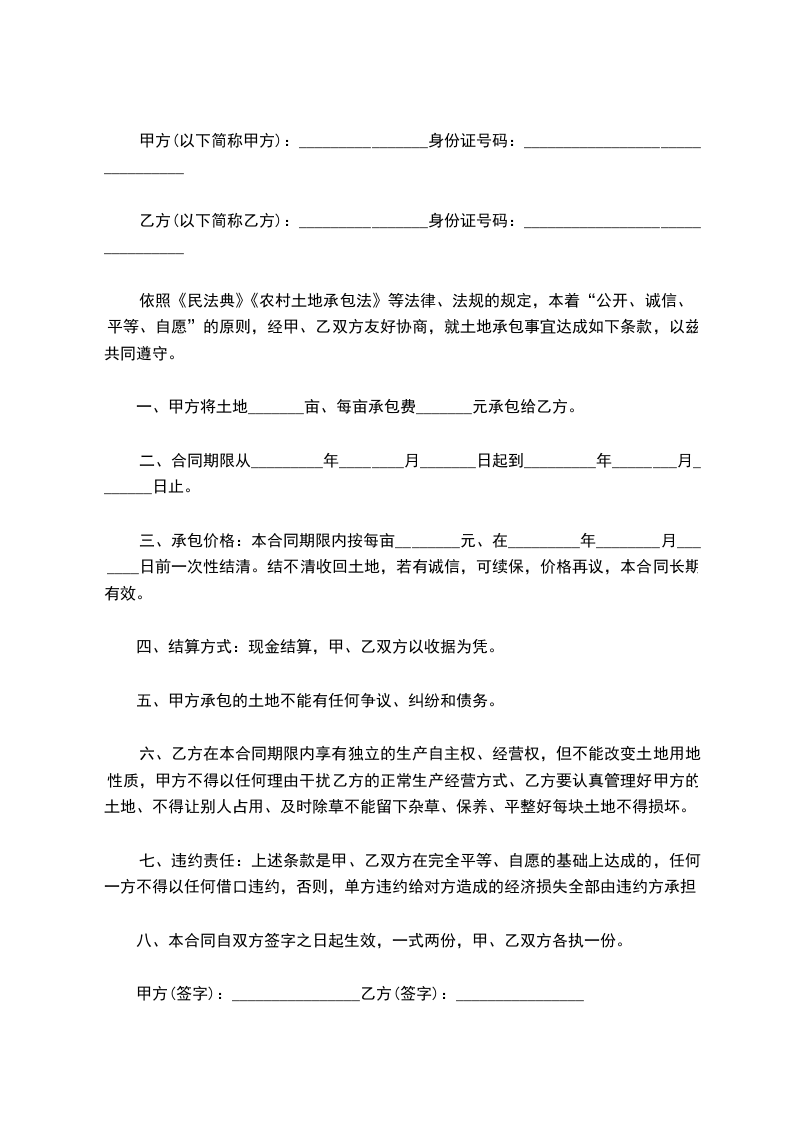 甲方将位于____土地承包给乙方开发经营,面积__亩(具体四至及面积以双方埋设的界桩及测量为准)。