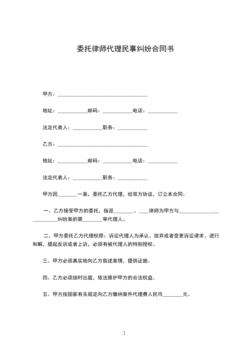 一、乙方接受甲方的委托,指派________、____律师为甲方与__________________________纠纷案的第________审代理人。