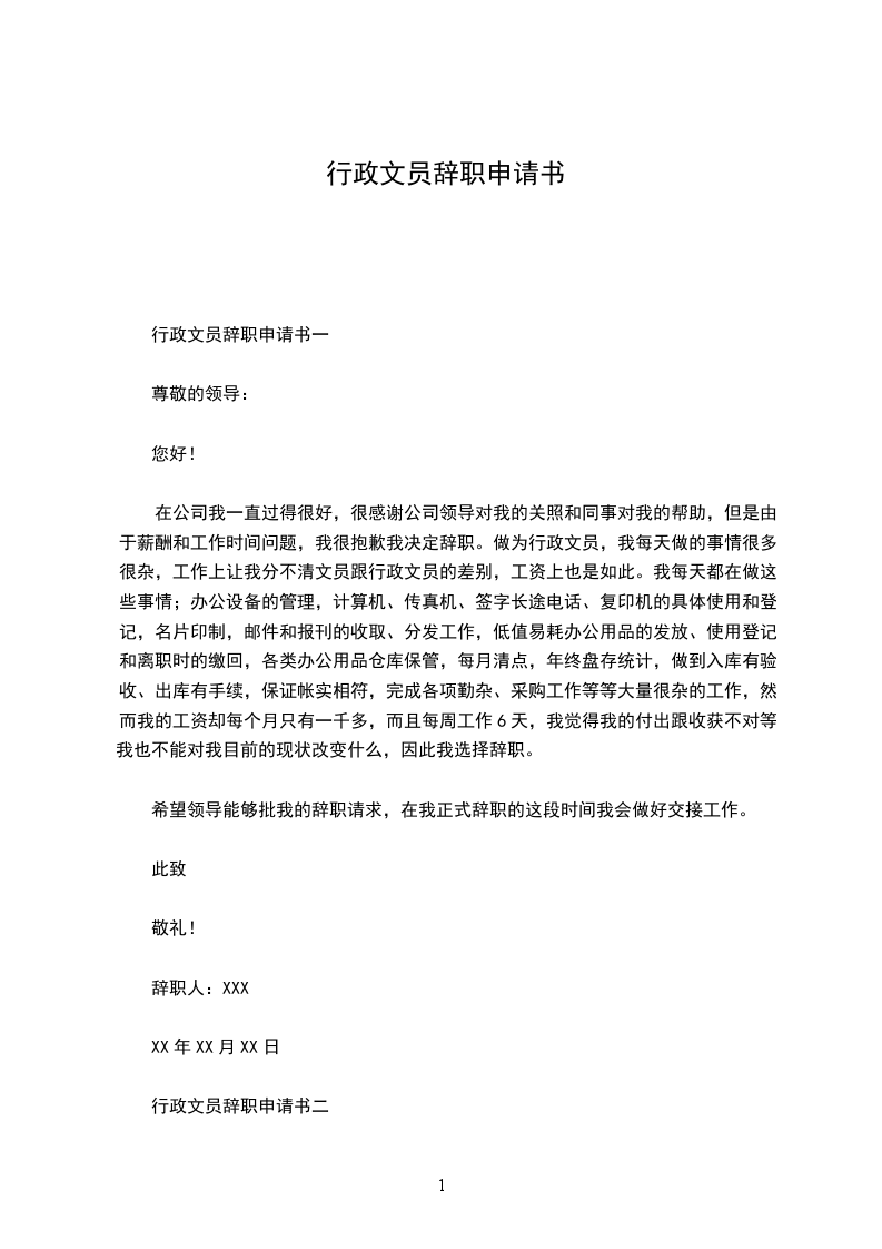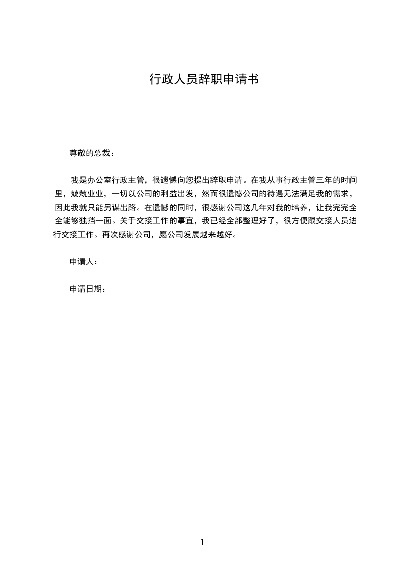 行政文员辞职申请书一
