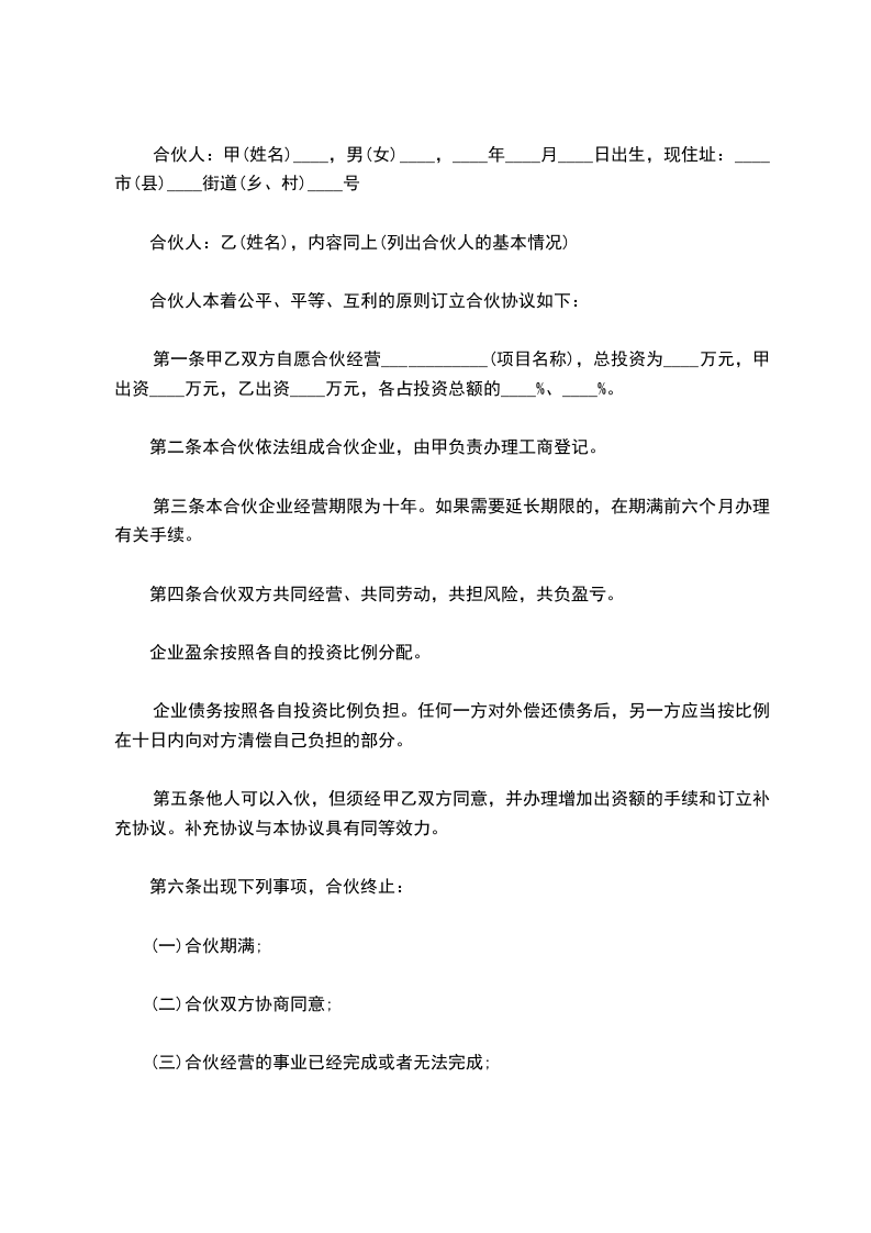 第一条甲乙双方自愿合伙经营____________(项目名称),总投资为____万元,甲出资____万元,乙出资____万元,各占投资总额的____%、____%。