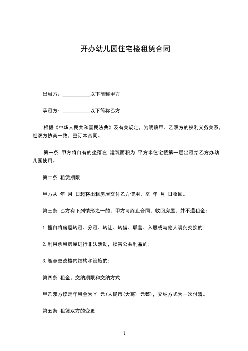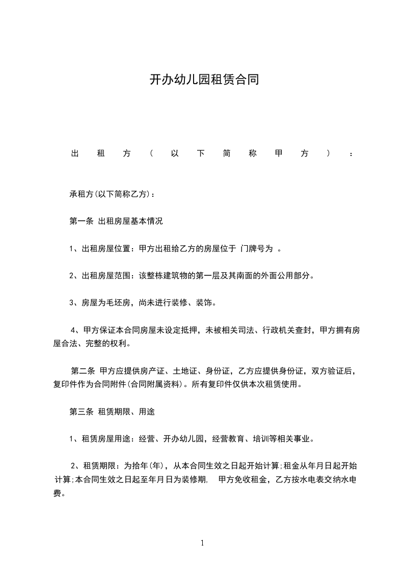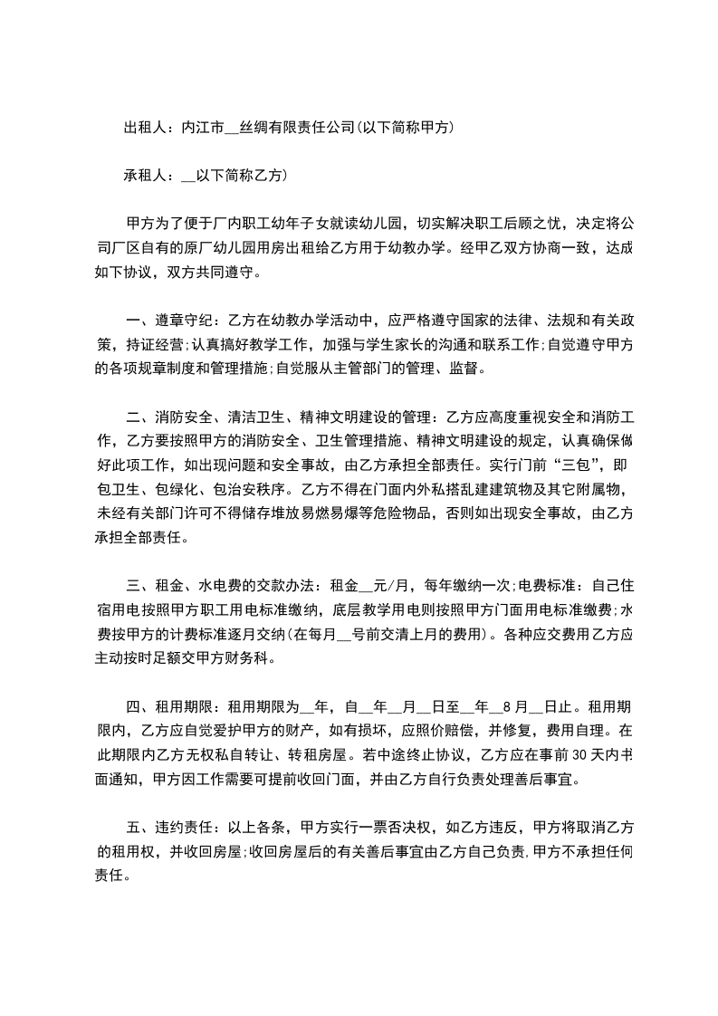 1、租赁房屋用途:经营、开办幼儿园,经营教育、培训等相关事业。