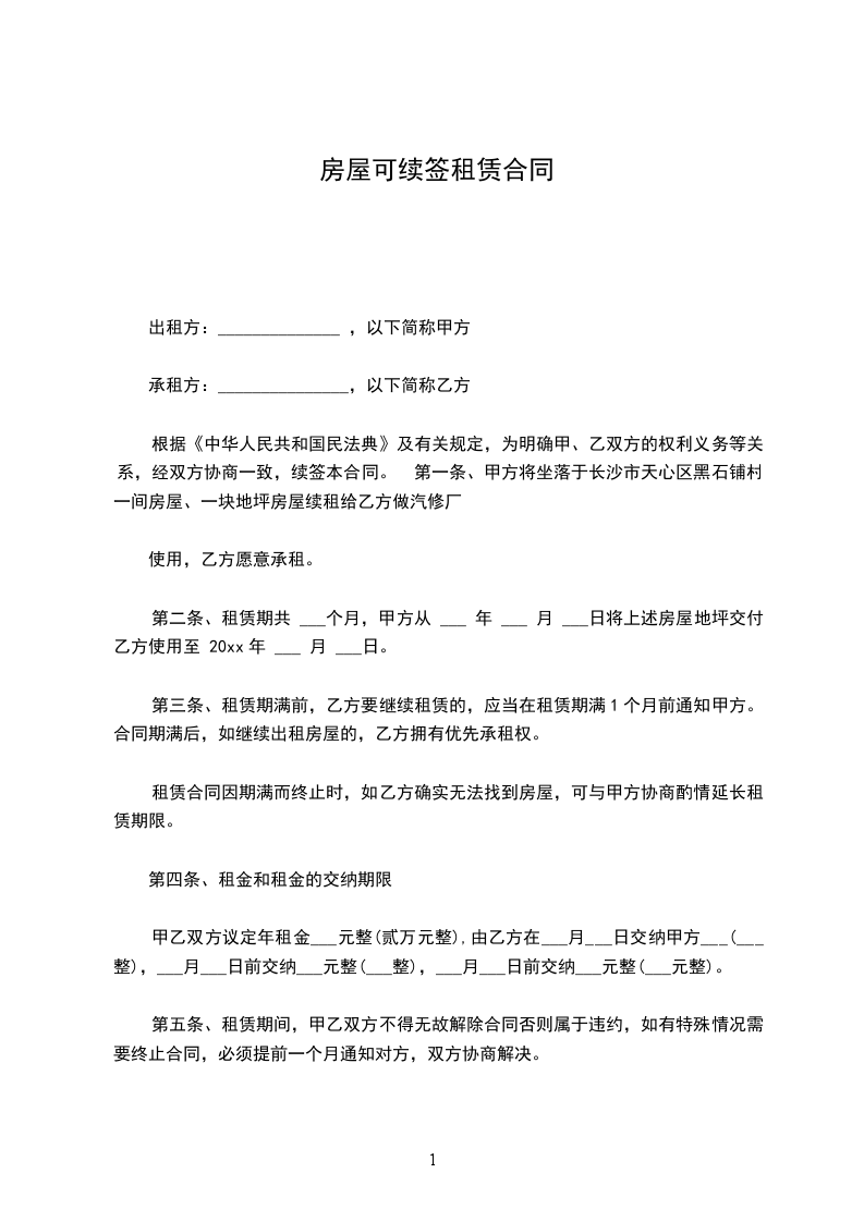 根据《中华人民共和国民法典》及有关规定,为明确甲、乙双方的权利义务等关系,经双方协商一致,续签本合同。 第一条、甲方将坐落于长沙市天心区黑石铺村一间房屋、一块地坪房屋续租给乙方做汽修厂