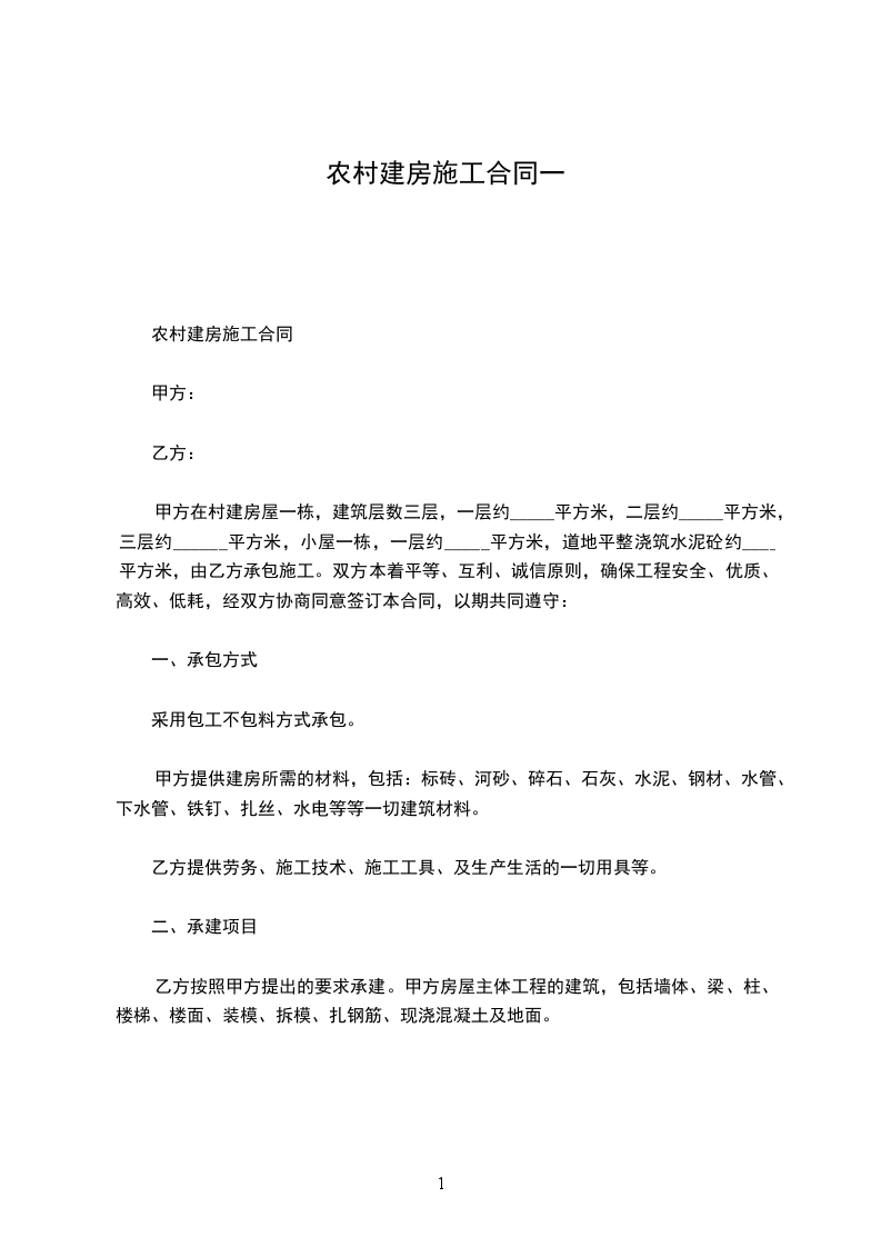 甲方在村建房屋一栋,建筑层数三层,一层约_____平方米,二层约_____平方米,三层约______平方米,小屋一栋,一层约_____平方米,道地平整浇筑水泥砼约____平方米,由乙方承包施工。双方本着平等、互利、诚信原则,确保工程安全、优质、高效、低耗,经双方协商同意签订本合同,以期共同遵守: